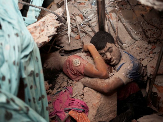 Una lágrima de sangre recorre el rostro del hombre. Abraza a una mujer. Una amiga, o una novia, o una hermana. No sabemos. El intento de salvación y la derrota en medio de los escombros. La arena cubriéndoles las ropas manchadas, los muros del edificio apretándoles la cintura. Sus contexturas se notan fuertes. Eran jóvenes. A lo mejor unos de los muchos que vinieron del campo a buscar oportunidades a Daca, dejando sus hijos allí. Unos de los tantos que viven en míseros ranchos para poder enviar algo de dinero a sus familias. A lo mejor tuvieron una larga agonía. Quizá supieron que estaban en el momento final. La lágrima delata el duelo por su propia muerte.