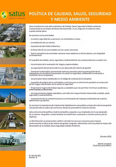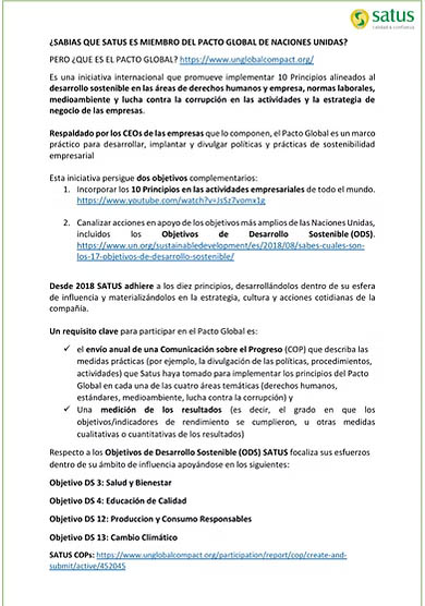 La empresa difunde que: “Desde 2018 SATUS adhiere a los diez principios, desarrollándolos dentro de su esfera de influencia y materializándolos en la estrategia, cultura y acciones cotidianas de la compañía. Un requisito clave para participar en el Pacto Global es: el envío anual de una Comunicación sobre el Progreso (COP) que describa las medidas prácticas (por ejemplo, la divulgación de las políticas, procedimientos, actividades) que Satus Ager haya tomado para implementar los principios del Pacto Global en cada una de las cuatro áreas temáticas (derechos humanos, estándares, medioambiente, lucha contra la corrupción) y Una medición de los resultados (es decir, el grado en que los objetivos/indicadores de rendimiento se cumplieron, u otras medidas cualitativas o cuantitativas de los resultados)”.