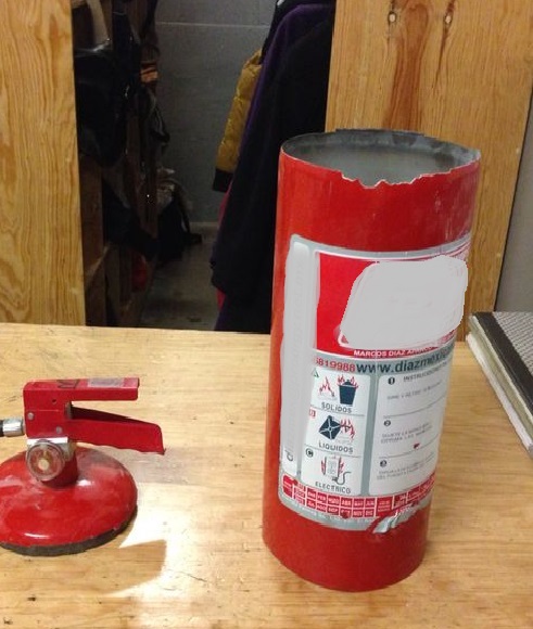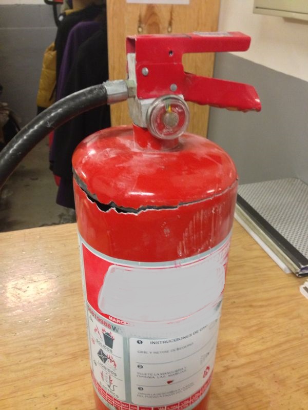 Un extintor contenido en un gabinete tipo cenicero explotó repentinamente, el aparato será sometido a una revisión para observar si éste cumple con la NOM-100-SCFI 1994 o el grado de desviación en la fabricación de los mismos.