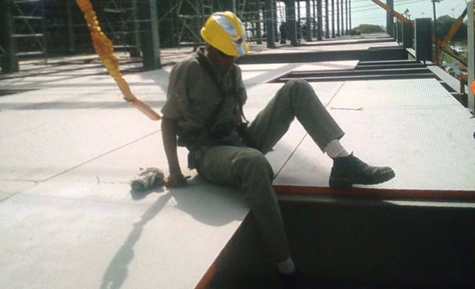 Fábio Hamilton da Cruz, de 23 anos, aparece com equipamento de segurança em imagens registradas no mesmo dia de sua morte, na obra do estádio do Timão