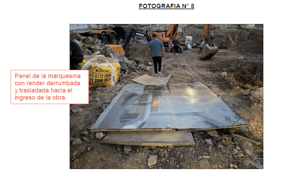 Dos pericias fueron clave para avanzar en la acusación. Entre ellas, está la realizada por los bomberos de la Policía de la Ciudad. El informe fue revelador: encontraron el render que se ubicaba dentro del cartel que mató a Lourdes al ingresar al predio. Las marquesinas, básicamente, estaban sostenidas por estructuras de simples pilotes, al borde de una excavación de movimiento de tierracon maquinaria pesada. Las estructuras hasta carecían de cruces para volverlas más rígidas.
