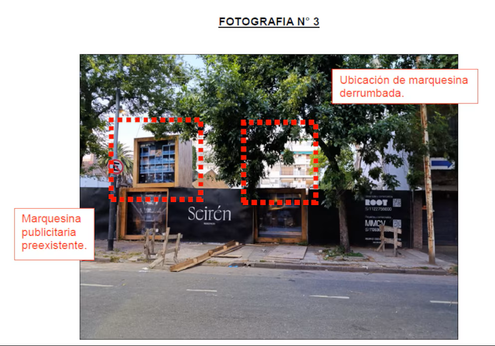 El fiscal siguió: “Resultó ser un muy importante y singular cartel publicitario (uno de dos similares) que también oficiaba y formaba parte integral de la empalizada perimetral de una obra en construcción desde sus cimientos”. Esta dualidad de función, según la imputación de la fiscalía, es clandestina.