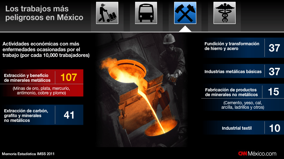 Los trabajadores que desarrollan más enfermedades se encuentran en la industria de la extracción de minerales: los mineros de oro, plata, mercurio, antimonio, cobre, plomo y carbón. Así como quienes trabajan en la fundición de hierro y acero y quienes participan en la fabricación de yeso, cal, ladrillos y arcilla, según datos del IMSS de 2011.