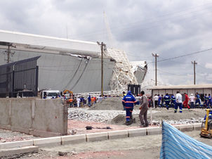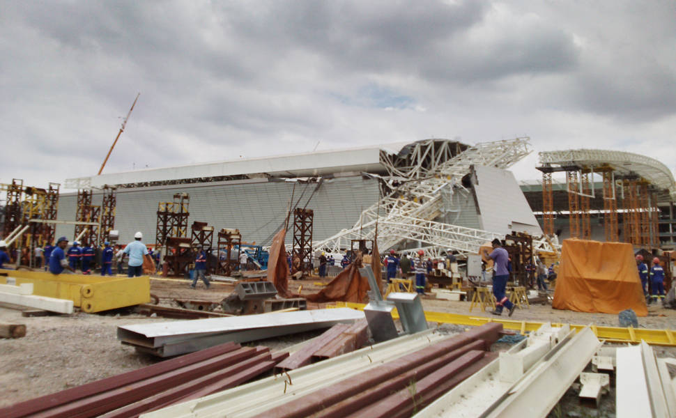 La última pieza del techo del estadio Itaquerao o Arena Corinthians se estaba instalando cuando se cayó sobre una de las tribunas. Destruyó parcialmente sus butacas y dejó una cifra de muertos aún indeterminada.