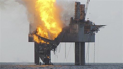 Abatement efforts underway on Wednesday, July 24, 2013, near Hercules 265 Rig where fire has caused collapse of the drill floor and derrick following an explosion Tuesday night. An out-of-control natural gas well burned Wednesday off Louisiana hours after it ignited following a blowout, though authorities said there was no sign of a slick on the surface of the water. On Thursday, regulators reported that sediment had blocked natural gas flowing from the well and remaining small flames were due to residual gas. (AP Photo/U.S. Coast Guard)