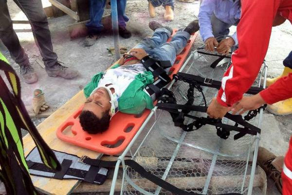 Compañeros de la obra y socorristas ayudaron a retirar al obrero herido de la construcción, para posteriormente trasladarlo a la Unidad de Urgencia de la clínica La Magdalena. El afectado, de 23 años se recuperaba en el centro asistencial, a donde ingresó con varias laceraciones y fractura en uno de los brazos.(Foto: Suministrada/ VANGUARDIA LIBERAL)