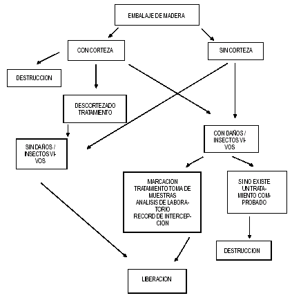 Bs. As., 4/1/2002 VISTO el expediente N° 5863/99 del registro del SERVICIO NACIONAL DE SANIDAD Y CALIDAD AGROALIMENTARIA, la Ley N° 4084 de Importación de Vegetales, y CONSIDERANDO: Que por el mencionado expediente, se solicita la adopción de medidas fitosanitarias para el ingreso de embalajes de madera y maderas de soporte y acomodación. Que es necesario adecuar las normas de intercambio comercial de materiales que puedan introducir plagas forestales exóticas, cuyo ingreso al país provocaría severos daños a la producción, al medio ambiente y a la economía del país. Que los embalajes de madera, maderas de soporte y acomodación representan un riesgo fitosanitario para la producción forestal del país, por ser un medio efectivo de introducción y dispersión de plagas forestales exóticas. Que en el ámbito regional, el MERCADO COMUN DEL SUR (MERCOSUR) y el Comité de Sanidad Vegetal del Cono Sur (COSAVE), recomiendan a los estados parte la adopción de medidas fitosanitarias que mitiguen el riesgo de introducción de plagas forestales con los embalajes de madera y maderas de soporte y acomodación. Que es necesario implementar el Sistema de Inspección Fitosanitaria de los embalajes de madera y maderas de soporte y acomodación, cualquiera sea la mercadería que transporten. Que el análisis de los registros de interceptación de plagas forestales de países como NUEVA ZELANDA y la REPUBLICA DE CHILE, corrobora el alto riesgo de introducción de plagas que estos materiales representan. Entre los géneros de plagas interceptadas por estos países se encuentran Monochamus, Ips, Dendroctonus, Heterobostrychus, Synoxilon, todos ellos ausentes en la REPUBLICA ARGENTINA. Que la introducción en los ESTADOS UNIDOS DE AMERICA del escarabajo de los cuernos largos (Anoplophora glabripennis) en embalajes de madera provenientes de la REPUBLICA POPULAR CHINA en el año 1996, produjo severos daños a la forestación y a la comercialización de productos forestales de ese país. Que la Dirección de Asuntos Jurídicos ha tomado la intervención que le compete. Que el suscripto es competente para dictar el presente acto, en virtud de lo establecido en el artículo 8°, inciso i) del Decreto N° 1585 del 19 de diciembre de 1996, sustituido por su similar N° 394 del 1° de abril de 2001. Por ello, EL PRESIDENTE DEL SERVICIO NACIONAL DE SANIDAD Y CALIDAD AGROALIMENTARIA RESUELVE: Artículo 1° — Las maderas de embalaje, soporte y acomodación, cuyo detalle forma parte del Anexo I de la presente resolución, usadas para transportar todo tipo de mercaderías que ingresen al país, deberán encontrarse libres de corteza, insectos y daños producidos por éstos. Art. 2° — Todos los embalajes de madera, maderas de soporte y acomodación detallados en su ingreso al país, deberán ser declarados ante la Dirección General de Aduanas, a la presentación del Despacho Aduanero. Art. 3° — Los inspectores del SERVICIO NACIONAL DE SANIDAD Y CALIDAD AGROALIMENTARIA se encuentran facultados para inspeccionar los embalajes de madera, las maderas de acomodación y soporte, cualquiera sea la carga que contengan y/o acarreen para su ingreso al país, como así también los medios de transporte, con el objetivo de determinar su estado fitosanitario. Art. 4° — Facúltase a los inspectores del SERVICIO NACIONAL DE SANIDAD Y CALIDAD AGROALIMENTARIA a ordenar las medidas fitosanitarias, cuando el estado fitosanitario así lo requiera, indicadas en el Anexo II que forma parte de la presente resolución. Art. 5° — De detectarse presencia de corteza, insectos vivos o daños producidos por éstos en las maderas utilizadas como embalaje, soporte, acomodación y/o en los medios de transporte de mercaderías de importación, se dará aviso a la Dirección General de Aduanas, para no liberar la mercadería, hasta tanto se cumpla con lo exigido por el SERVICIO NACIONAL DE SANIDAD Y CALIDAD AGROALIMENTARIA. Art. 6° — Los costos que surjan de la aplicación de los procedimientos descriptos en el Anexo II de la presente resolución, estarán a cargo del importador de la mercadería. Art. 7° — El SERVICIO NACIONAL DE SANIDAD Y CALIDAD AGROALIMENTARIA dispondrá los procedimientos administrativos que considere necesarios para garantizar la efectiva implementación de la presente resolución. Art. 8° — El incumplimiento de lo dispuesto por la presente resolución, dará lugar a la aplicación de sanciones previstas en el artículo 18 del Decreto N° 1585 del 19 de diciembre de 1996. Art. 9° — Comuníquese, publíquese, dése a la Dirección Nacional del Registro Oficial y archívese. — Bernardo G. Cané. ANEXO I TERMINOS DE EMBALAJE, SOPORTE Y MADERAS DE ACOMODACION DE CARGAS Madera de acomodar, madera de estiba, taco, cuña y travesaño: piezas móviles de madera de distintas medidas destinadas a mantener, separar y/o asegurar firmemente las mercaderías dispuestas en un recinto o medio de transporte. Caja y cajón: recipientes de madera aserrada o de tableros, de distintas formas y tamaños, cuyos componentes se aseguran firmemente para constituir una estructura rígida, con el objeto de proteger, transportar o contener mercaderías. Carretel de cable o bobina: estructura cilíndrica de madera confeccionada con ruedas en sus extremos del mismo material, destinada a transportar cables y alambre. Palet o plataforma: estructura horizontal con altura mínima compatible con su manipulación con cargador frontal, utilizada como soporte para reunir, almacenar y/o transportar mercaderías en forma de carga unitaria. Bins: estructura cuadrangular no cubierta de madera manipulable con cargador frontal, destinada al transporte de productos frutihortícolas. Contenedor: estructura rectangular de dimensiones normalizadas, diseñadas para transportar cargas unitarias, motores, bultos, etc., el que es rápidamente transferible entre diferentes medios de transporte. ANEXO II PROCEDIMIENTO GENERAL DE INSPECCION FITOS