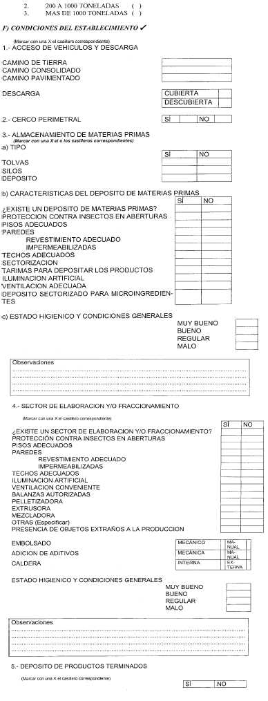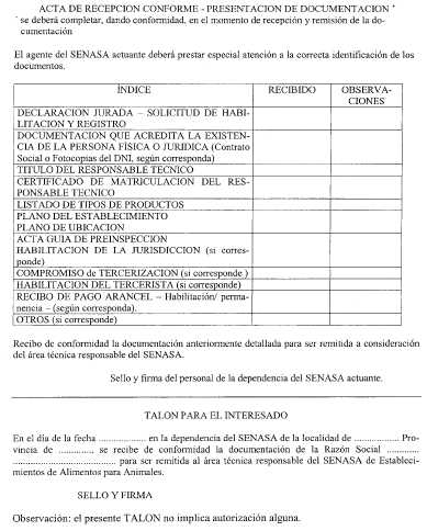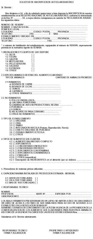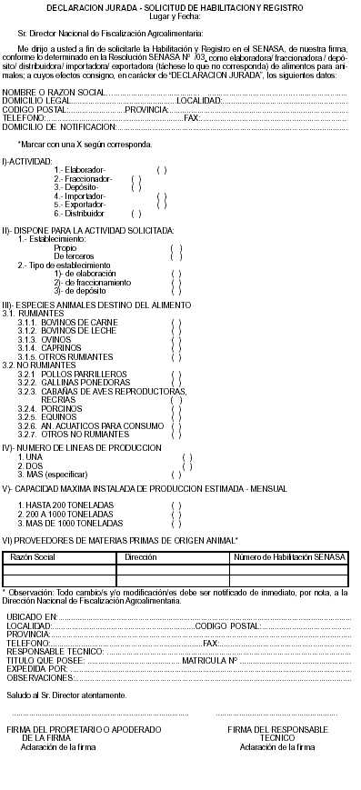 Apéndice 2 DOCUMENTACION REQUERIDA Las personas físicas o jurídicas interesadas deberán presentar la SOLICITUD DE HABILITACION Y REGISTRO, según modelo que consta como Apéndice 1 Capítulo II, conjuntamente con la documentación que se detalla, según corresponda: A. FIRMAS ELABORADORAS CON ESTABLECIMIENTO PROPIO: - Contrato social autenticado por escribano . - En el caso de tratarse de una empresa unipersonal, fotocopia autenticada de primera y segunda hoja del Documento Nacional de Identidad (D.N.I.) y de la Clave Unica de Identificación Tributaria (C.U.I.T.) . - En el caso de tratarse de sociedades de hecho, carta-compromiso de los integrantes, con fotocopias autenticadas de primera y segunda hoja del D.N.I. de cada uno de ellos y del C.U.I.T . - Fotocopia autenticada de la habilitación municipal acorde a la actividad a desarrollar . - Descripción del tipo de alimentos a elaborar . - Plano de ubicación, con sus vías de acceso escala UNO EN DOS MIL (1:2000), en el caso de tratarse de establecimientos rurales . - Copia del plano escala UNO EN CIEN (1:100) aprobado por Municipalidad, según corresponda . - Esquema coincidente con el plano indicando dependencias, equipos fijos e instalaciones . - Memoria descriptiva física-edilicia . - Flujograma operativo . - Protocolo de análisis de agua, físico químico y bacteriológico, realizado por Organismo Oficial competente, según corresponda . - Declarar si los controles de calidad de los productos se efectuarán en laboratorio propio y/o de terceros . - Declarar si además de elaborar alimentos, en el establecimiento se realiza otra actividad (detallar) . - Carta presentación del profesional a cargo de la Responsabilidad Técnica . - Fotocopia reducida y autenticada del título profesional del responsable técnico y certificado de vigencia de la habilitación profesional, librado por la autoridad emisora de la misma (Matrícula) . B. FIRMAS QUE ELABORAN EN ESTABLECIMIENTOS DE TERCEROS HABILITADOS: - Contrato social autenticado por escribano . - En el caso de tratarse de una empresa unipersonal, fotocopia autenticada de primera y segunda hojas del D.N.I. y del C.U.I.T . - En el caso de tratarse de sociedades de hecho, carta-compromiso de los integrantes, con fotocopias autenticadas de primera y segunda hoja del D.N.I. de cada uno de ellos y del C.U.I.T . - En el caso de tratarse de empresas unipersonales y sociedades de hecho deberán presentar certificación legal del domicilio emitida por autoridad competente . - Fotocopia de la habilitación otorgada por el SENASA a la firma elaboradora, para la elaboración de productos destinados a la alimentación animal . - Carta del Elaborador declarando que acepta elaborar para el tercero solicitante . - Declarar si los controles de calidad de los productos se efectuarán en laboratorio propio y/o de terceros . - Carta presentación del profesional a cargo de la Responsabilidad Técnica . - Fotocopia reducida y autenticada del título profesional del responsable técnico y certificado de vigencia de la habilitación profesional, librado por la autoridad emisora de la misma (Matrícula) . C. FIRMAS DISTRIBUIDORAS, IMPORTADORAS Y EXPORTADORAS CON DEPOSITO PROPIO . - Contrato social autenticado por escribano . - En el caso de tratarse de una empresa unipersonal, fotocopia autenticada de primera y segunda hoja del D.N.I. y del C.U.I.T . - En el caso de tratarse de sociedades de hecho, carta-compromiso de los integrantes, con fotocopias autenticadas de primera y segunda hoja del D.N.I. de cada uno de ellos y del C.U.I.T . - Fotocopia autenticada de la habilitación municipal acorde a la actividad a desarrollar . Si el depósito es alquilado deberá presentar el contrato de locación . - Descripción del tipo de alimentos a depositar . - Copia del plano en escala UNO EN CIEN (1:100) aprobado por Municipalidad . - Memoria descriptiva física-edilicia . - Protocolo de análisis de agua, físico químico y bacteriológico, realizado por Organismo Oficial competente, según corresponda . - Declarar si además de depositar alimentos, en el establecimiento se realiza otra actividad (detallar) - Carta presentación del profesional a cargo de la Responsabilidad Técnica . - Fotocopia reducida y autenticada del título profesional del responsable técnico y certificado de vigencia de la habilitación profesional, librado por la autoridad emisora de la misma (Matrícula) . D. FIRMAS DISTRIBUIDORAS, IMPORTADORAS Y EXPORTADORAS CON DEPOSITO EN TERCEROS . - Contrato social autenticado por escribano . - En el caso de tratarse de una empresa unipersonal, fotocopia autenticada de primera y segunda hoja del D.N.I. y del C.U.I.T . - En el caso de tratarse de sociedades de hecho, carta-compromiso de los integrantes, con fotocopias autenticadas de primera y segunda hoja del D.N.I. de cada uno de ellos y del C.U.I.T . - En el caso de tratarse de empresas unipersonales y sociedades de hecho deberán presentar certificación legal del domicilio emitida por autoridad competente . - Fotocopia de la habilitación otorgada por este Organismo a la firma titular del depósito para productos destinados a la alimentación animal . - Carta del responsable del depósito declarando que acepta depositar . - Carta presentación del profesional a cargo de la Responsabilidad Técnica . - Fotocopia reducida y autenticada del título profesional del responsable técnico y certificado de vigencia de la habilitación profesional, librado por la autoridad emisora de la misma (Matrícula) . E. AUTOELABORADORES . - Contrato social autenticado por escribano . - En el caso de tratarse de una empresa unipersonal, fotocopia autenticada de primera y segunda hoja del D.N.I. y del C.U.I.T . - En el caso de tratarse de sociedades de hecho, carta-compromiso de los integrantes, con fotocopias autenticadas de primera y segunda hoja del D.N.I. de cada uno de ellos y del C.U.I.T . - Fotocopia autenticada de la habilitación municipal acorde a la act
