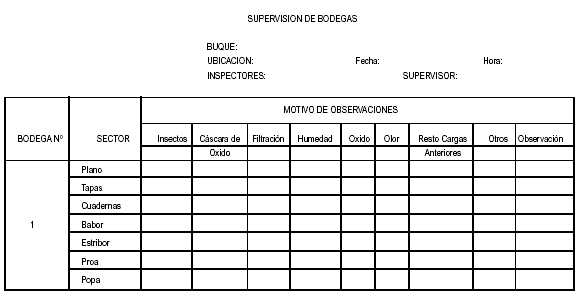El responsable se hará presente en la rada o en el muelle al momento de la carga. En ambos casos, se cumplimentará el Formulario de Supervisión, según el modelo que obra como Anexo IV de la presente norma; éste será de uso interno, se confeccionará en cada oportunidad que el supervisor chequee bodegas y se archivará en el expediente que dio origen a la tarea.