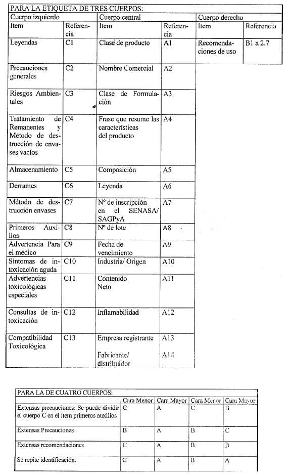 La distribución de los espacios (% de la superficie para cada cuerpo) será libre para las etiquetas de DOS (2), TRES (3) ó CUATRO (4) cuerpos. En el ancho adoptado para cada cuerpo la distribución de la información deberá ser horizontal, legible y corresponder solamente a dicho cuerpo. 5) SIMBOLOS, COLORES Y FRASES DE ADVERTENCIA La etiqueta deberá presentar en su parte inferior una banda de color que identifica la categoría toxicológica del Producto Fitosanitario. Tendrá una altura entre el DIEZ (10) y el QUINCE POR CIENTO (15%) de la altura del marbete, con un mínimo de UN (1) centímetro, en la cual se colocarán el símbolo pictórico y la frase de advertencia correspondiente, pudiendo colocar también los pictogramas. El color de la banda se rige por la clasificación de peligrosidad de la ORGANIZACION MUNDIAL DE LA SALUD (OMS). Los colores reglamentados son los dispuestos en el Capítulo Nº 20 de la Resolución Nº 350 del 30 de agosto de 1999 de la ex-SECRETARIA DE AGRICULTURA, GANADERIA, PESCA Y ALIMENTACION, y otras normas que se dicten al efecto. Los pictogramas pueden estar fuera de la banda toxicológica; en este caso deberán estar en el cuerpo de Precauciones (en forma vertical). Sólo se deben colocar aquellos pictogramas necesarios de acuerdo al riesgo del producto. Deben ser de color negro sobre fondo blanco. Deberá figurar el símbolo pictórico (Calavera y tibias o Cruz de San Andrés) de advertencia, según lo dispuesto en el Capítulo Nº 20 de la Resolución ex-SAGPyA Nº 350/99. El símbolo pictórico será de color negro sobre fondo blanco e irá montado sobre la banda toxicológica, es decir los vértices laterales del rombo deben coincidir con la línea superior de la banda, sobresaliendo su mitad superior por encima de la misma. Este símbolo deberá estar colocado en el cuerpo de identificación del producto, pudiendo repetirse en los otros cuerpos. Debajo de este símbolo irá la frase de advertencia. Cuando por la toxicidad del producto no corresponda colocar un símbolo pictórico (Calavera y tibias, o Cruz de San Andrés), la frase de advertencia deberá colocarse en el cuerpo de identificación, pudiendo repetirse en los otros cuerpos. Las frases de advertencia corresponderán a los establecidos por las normas vigentes, Resolución ex-SAGPyA Nº 350/99, Capítulo 20. El fondo de las etiquetas deberá ser blanco y las letras negras, a excepción del ítem C9 que será de color rojo (pantone 199 C). Se aceptará cualquier color en el o los logotipos y marca comercial. Podrán incluirse aspectos de artes gráficas en cualquier color, siempre que se refieran al producto en cuestión. Los mismos deberán ubicarse en el cuerpo de identificación. Sellos o frases que indiquen que la empresa registrante o el producto cumplen con normativas internacionales deberán ubicarse fuera de la etiqueta. 6) TIPOGRAFIA El tamaño mínimo de impresión será el de OCHO (8) puntos tipográficos, con una interlínea de DOS (2) puntos para los ítems C del Punto 3) del presente Anexo. Para los demás ítems el tamaño de los caracteres no deberá ser nunca inferior a SIETE (7) puntos tipográficos con una interlínea de UN (1) punto. El tipo de imprenta deberá ser claro y sin decoraciones. La impresión en bastardilla o cursiva, de utilizarse, corresponderá únicamente para los nombres científicos. Los encabezamientos irán en negrita. Todos los textos deberán ser legibles horizontalmente cuando el envase o embalaje se encuentre en posición vertical normal, con un único idioma: el castellano, salvo lo referente al nombre comercial en que podrá emplearse cualquier otro. |
