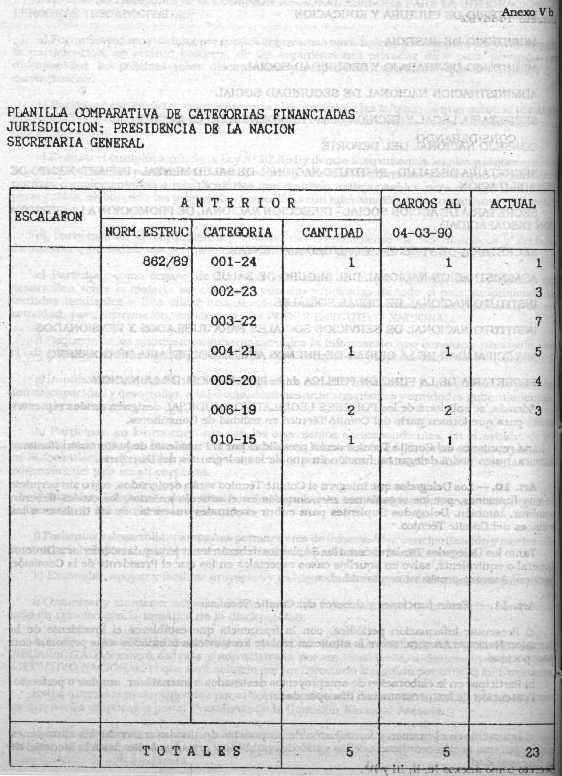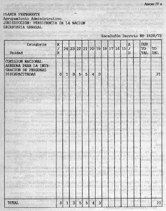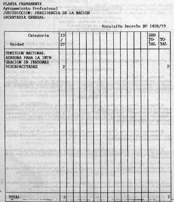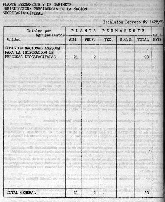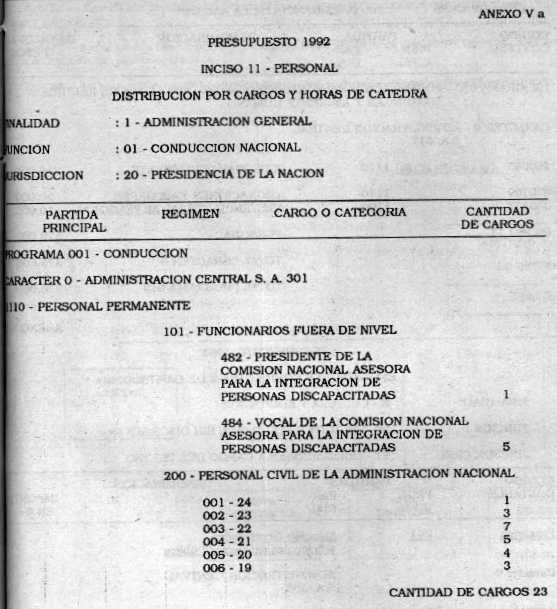 Bs. As., 18/6/92 VISTO las Leyes Nros. 23.696 y 23.697, el Programa de Reforma Administrativa implementado por el Decreto Nº 2476/90, el Decreto Nº 1101/87 y lo propuesto por la SECRETARIA GENERAL de la PRESIDENCIA DE LA NACION con respecto a la COMISION NACIONAL ASESORA PARA LA INTEGRACION DE PERSONAS DISCAPACITADAS, y CONSIDERANDO: Que mediante las normas legales citadas en el "Visto" se declararon, respectivamente, las Emergencias Administrativa y Económica y que, dado el estado de grave desorganización administrativa que imperaba en la Administración Nacional, resultaba necesario poner en marcha un Programa de Reforma Administrativa, el que se diseñó a través del citado Decreto Nº 2476/90. Que por el Decreto Nº 1101/87 se determinó la normativa aplicable para la composición, funcionamiento y jurisdicción de la mencionada COMISION NACIONAL ASESORA PARA LA INTEGRACION DE PERSONAS DISCAPACITADAS. Que es responsabilidad del Estado atender a la plena integración de las personas discapacitadas, con iguales derechos y obligaciones que el resto de la población. Que la acción estatal frente a la problemática de las personas con discapacidad debe ser encarada por un ente interorgánico de coordinación y de asesoramiento, en razón de la naturaleza global de aquélla, tal como lo consideran las normas y declaraciones de carácter nacional e internacional y, en especial, la Ley Nº 22.431. Que ese cometido se ha ido cumpliendo con eficacia a través de la mencionada Comisión Nacional Asesora, cuya actuación ha puesto en evidencia la necesidad de mantener el alcance e imperio de sus acciones mediante su organización dentro del ámbito del PODER EJECUTIVO NACIONAL, a través de la SECRETARIA GENERAL de la PRESIDENCIA DE LA NACION. Que esta jerarquización se corresponde con el sentir manifestado reiteradamente por las organizaciones que nuclean a personas con discapacidad y está aconsejada por los organismos internacionales especializados en la materia. Que las funciones en que se ratifica al ente no implican detrimento alguna de la competencia y funciones ejecutivas asignadas por la legislación vigente a los Ministerios correspondientes y sus dependencias. Que, hasta estos momentos, el aludido organismo de asesoramiento no ha contado con una estructura orgánica adecuada para permitir su normal funcionamiento, dado que la aprobada mediante Decreto Nº 862 del 26 de junio de 1989, aún vigente, contempló una planta con sólo CINCO (5) cargos, por lo cual se encuentra extremadamente limitada la posibilidad de desarrollar sus actividades con la amplitud debida. Que, a fin de regularizar la situación antes mencionada, resulta indispensable aprobar una nueva estructura organizativa, con estricto ajuste, no obstante, a los principios sentados en materia de contención del gasto público. Que, independientemente de lo señalado y a tenor de lo ya expuesto sobre el particular, resulta oportuna la ocasión para modificar la relación de dependencia dentro de la cual deberá actuar el organismo tratado. Que el COMITE EJECUTIVO DE CONTRALOR DE LA REFORMA ADMINISTRATIVA ha tomado la intervención que le compete, expidiéndose favorablemente. Que la presente medida se dicta en uso de las atribuciones emergentes del artículo 86, inciso 1, de la Constitución Nacional. Por ello, EL PRESIDENTE DE LA NACION ARGENTINA DECRETA: Artículo 1º — Apruébase la estructura organizativa de la COMISION NACIONAL ASESORA PARA LA INTEGRACION DE PERSONAS DISCAPACITADAS, la que funcionará en el ámbito del PODER EJECUTIVO NACIONAL a través de la SECRETARIA GENERAL de la PRESIDENCIA DE LA NACION, según el Organigrama, Responsabilidad Primaria y Acciones, Planta Permanente, Planpa Permanente y de Gabinete y Planilla Comparativa de Categorías Financiadas que, como Anexos I, III, Iva, Ivb y Vb, forman parte del presente decreto, el cual resulta modificatorio, en consecuencia, de la estructura organizativa de dicha Secretaría General, aprobada por Decretos Nros. 1477/91 y 166/92. Art. 2º — Apruébase la distribución por cargos y horas de cátedra que, como Anexo Va, integra también esta medida. Art. 3º — Dentro de los TREINTA (30) días corridos a partir de la fecha de publicación del presente decreto, se efectuarán los movimientos de personal que sean necesarios para la implementación de la estructura organizativa aquí aprobada. Art. 4º — Son funciones de la COMISION NACIONAL ASESORA PARA LA INTEGRACION DE PERSONAS DISCAPACITADAS: a) Formular consensuadamente con los organismos nacionales y provinciales pertinentes y con la participación, en cuanto proceda, de las organizaciones privadas de y para personas con discapacidad, las políticas sobre discapacidad y proponer su aprobación por los órganos que correspondan. b) Participar con carácter vinculante en la elaboración de las iniciativas que, sobre la temática, proyecten las áreas competentes, manteniendo un permanente análisis sobre el desarrollo de las que se aprueben. c) Evaluar el cumplimiento de la Ley Nº 22.431 y demás instrumentos legales y reglamentarios relacionados con las personas con discapacidad y analizar la conveniencia de que se sancionen normas complementarias o modificatorias que resulten indispensables para el logro de los fines perseguidos, elaborando las propuestas respectivas con intervención de los organismos competentes. d) Participar en el seguimiento y estudio del cumplimiento de las directivas y acciones dispuestas o iniciadas, sin perjuicio de las atribuciones propias de cada organismo. e) Participar como órgano de consulta vinculante en la coordinación de las labores que desarrollen sobre la materia las entidades públicas y privadas de todo el país, proponiendo las medidas tendientes a una eficaz articulación de tales labores y evaluar los resultados de esa actividad, para información, en su caso, del PODER EJECUTIVO NACIONAL. f) Requerir de los organismos gubernamentales la información