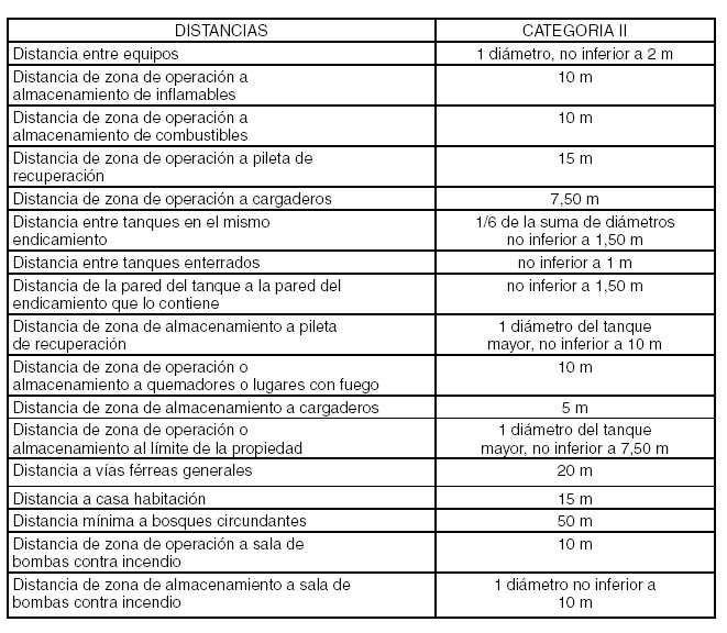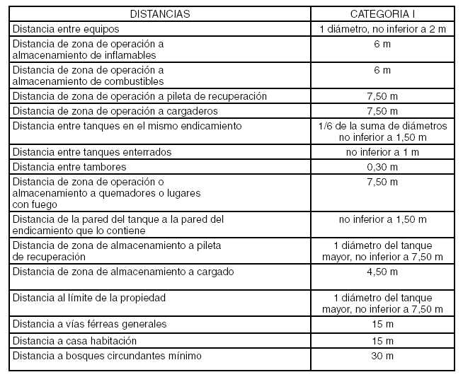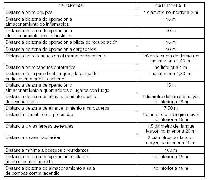 Notas: a) Si el recipiente no posee sección cilíndrica se considerará el diámetro de la circunferencia que contenga la superficie del equipo; b) Si el recipiente es cilíndrico de eje horizontal y dispuesto en batería, la distancia mínima de separación entre generatrices de los mismos se basará exclusivamente en el diámetro.