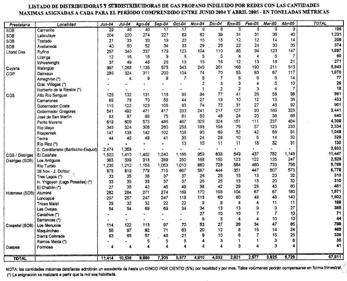Artículo 1º.- Las Empresas Productoras se comprometen a abastecer a las Distribuidoras y Subdistribuidoras de Gas Propano Indiluido por Redes, desde el 1º de mayo de 2004 hasta el 31 de Abril de 2005, las cantidades máximas de gas propano para las Redes de Distribución de Gas Propano Indiluido actualmente en funcionamiento en todo el territorio de la REPUBLICA ARGENTINA y debidamente registradas en el ENTE NACIONAL REGULADOR DEL GAS, a un precio salida de planta (el "Precio Acordado") establecido en PESOS TRESCIENTOS POR TONELADA METRICA ($/TM 300). Dicho precio podrá ser incrementado por la SECRETARIA DE ENERGIA.