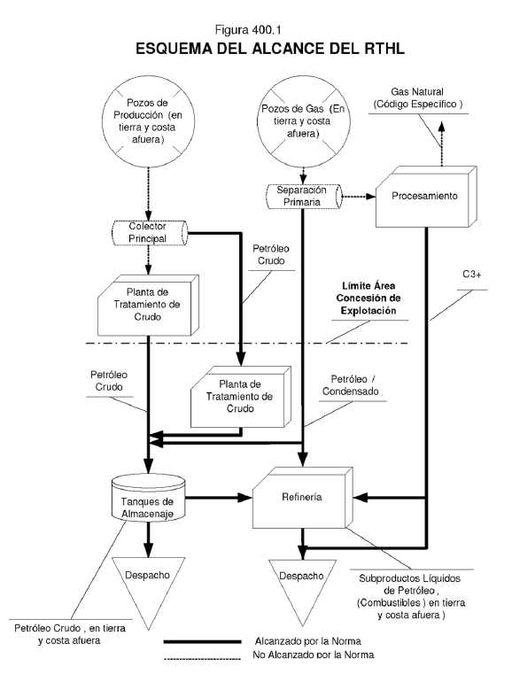 400.1 [ R ] Alcance General [ R ] Este Reglamento Técnico (RT) establece los requisitos mínimos de seguridad para el diseño, los materiales, la construcción, el montaje, la inspección, los ensayos, la operación, el mantenimiento y la integridad de los sistemas de cañerías que transportan hidrocarburos líquidos tales como: § Petróleo crudo.§ Condensados.§ Gasolina.§ Líquidos del gas natural.§ Gas licuado de petróleo.§ Subproductos líquidos del petróleo.Entre: (Ver Figura 400.1) a. Colector principal de una Concesión de Explotación a Planta de Tratamiento de Petróleo fuera de la misma. b. Entre Planta de Tratamiento de Petróleo crudo y Playa de tanques. c. Playas de tanques. d. Subproductos líquidos de plantas de procesamiento de gas natural a otras plantas o despacho e. Refinerías a despacho. f. Estaciones de bombeo. g. Playa de Tanques de terminal a boya. h. Otros puntos de despacho y recepción de producto. En consecuencia las instalaciones incluidas dentro del alcance de esta norma son: a. Cañería principal entre terminales de ductos (marinas, férreas y de camiones), estaciones de bombeo y estaciones reductoras de presión y estaciones de medición, incluyendo las trampas de scraper y los loops de prueba. b. Cañerías de interconexión entre tanques de Almacenaje y Despacho, propias de la operación del caño. c. Aquellos aspectos de operación, mantenimiento e inspección de los sistemas de caños de hidrocarburos líquidos relacionados a la seguridad y la protección del público en general, personal de la compañía operadora, el ambiente, propiedades y los sistemas de cañerías. d. Cañerías costa afuera. e. Sistemas de protección catódica. f. Sistemas de detección de pérdidas. 400.1.1 [ R ] Exclusiones del alcance de este Reglamento Técnico (RT) [ R ] Quedan excluidas del alcance del presente Reglamento Técnico (RT) las siguientes instalaciones: a. Cañerías auxiliares tales como cañerías de agua, aire, vapor, aceite lubricante y gas combustible. b. Recipientes de presión, intercambiadores de calor, bombas, medidores y otros equipos de los circuitos auxiliares. c. Cañerías diseñadas para presiones internas: c.1 Por debajo de 15 psi (1 bar), prescindiendo de la temperatura. c.2 Superiores a 15 psia (1 bar) si la temperatura de diseño está por debajo de –30°C (-22 °F) o sobre 120° C (248 °F). d. Entubado, caño, o cañerías usados en pozos de petróleo, montajes de bocas de pozos, colectores, separadores de petróleo y gas, tanques de producción de petróleo, otras instalaciones de producción y cañerías de interconexión de esas instalaciones, que no salgan del área de Concesión de Explotación. e. Cañerías internas de plantas de tratamiento de petróleo crudo, plantas de almacenaje, procesadoras de gas, de gasolina y refinerías de petróleo. f. Cañerías de transporte y distribución de gas natural. 400.2 [ A ] DEFINICIONES [ A ] Algunos de los términos más comunes relacionados a este Reglamento están contenidos en el código de referencia, sin embargo las siguientes definiciones amplían o complementan las que se encuentran en dicho código. Accidente / Incidente: Suceso imprevisto que puede derivar en daño a personas, instalaciones y/ o al ambiente. Cuasi-accidente: Cuando se han dado las condiciones para la ocurrencia de un accidente pero no se concretó el mismo. Colector principal de una Concesión de Explotación: Instalación en la que se recibe todo el petróleo crudo sin tratamiento y desde la cual se envía el mismo a una Planta de Tratamiento de Crudo. Condensados: Mezcla de hidrocarburos presentes en el gas natural extraído de los yacimientos que se encuentran en el estado líquido o vaporizado y que son separados por medio de separadores primarios a 15 °C, y a 1 atmósfera, se presentan en estado líquido. Tienen una densidad relativa de más de 0,710 y menor de 0,800 (grados °API de 68 a 45) una Presión de Vapor Reid a 37,8 °C no mayor de 103.42 kPa (15 psig) y un punto final de destilación mayor de 200 °C y menor de 400 °C. Condiciones anómalas: estado que dura un tiempo limitado en el cual el sistema, como consecuencia de una falla imprevista, se aleja de las condiciones de presión, temperatura, caudal, composición química (o combinaciones de más de una de ellas) para las cuales fue diseñado. Cañerías de Captación: son las destinadas a recolectar los hidrocarburos de los pozos productores hasta la planta de tratamiento. Falla: inhabilidad de cualquier activo físico para satisfacer las condiciones para las cuales fue diseñado. Fluidos Categoría A: fluidos inflamables en estado líquido a presión y temperatura ambiente. Ejemplos: petróleo crudo, condensado, gasolina y subproductos líquidos del petróleo. Fluidos Categoría B: fluidos inflamables que se presentan como gases a temperatura y presión ambiente, pero son transportados en estado líquido por modificación de las condiciones de presión y temperatura. Ejemplos típicos son los líquidos del gas natural, gas licuado de petróleo, propano y butano. Gasolina: mezcla de hidrocarburos presentes en el gas natural extraído de los yacimientos, separados al estado líquido por medio de operaciones de enfriamiento mecánico o por procesos industriales propios de las plantas de acondicionamiento del gas natural y/o extracción de gas licuado. Se encuentra en estado líquido en condiciones estándar de presión y temperatura (1 atmósfera y 15 °C), el que estabilizado debe tener una Presión de Vapor Reid a 37,8 °C no mayor de 103.42 kPa (15 psig). Tienen una densidad relativa mayor de 0,600 y menor de 0,710 (grados API 104 a 68) y un punto final de destilación mayor de 100 °C y menor de 200 °C. Imperfección: una discontinuidad o irregularidad detectada por un método de inspección. Legajo Técnico de obra: aquel documento que contendrá como mínimo: · Planialtimetría con plantas y cortes del tendido del sistema de cañ