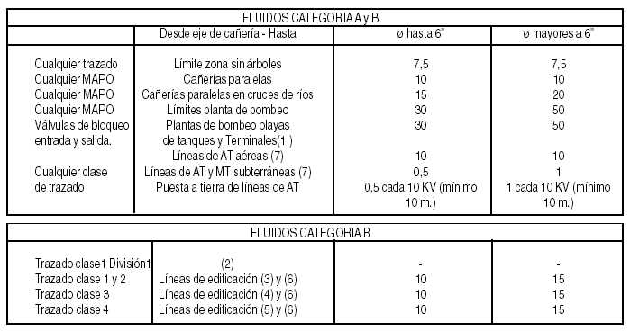 NOTAS: (1) Las válvulas deben ubicarse bajo tierra, preferentemente en cámaras. De acuerdo con el estudio de riesgo que efectúe el operador, las válvulas pueden requerir ser telecomandadas además de ser operables manualmente. (2) No existen viviendas, ni lugares cerrados o abiertos donde habitualmente se reúnan más de 20 personas. (3) El espesor de la cañería se calculará con un factor de diseño F = 0,5 en una longitud de 200 m aguas arriba y abajo de los edificios extremos del grupo que determina la clase de trazado. (4) El espesor de la cañería se calculará con un factor de diseño F = 0,4 en una longitud de 200 m aguas arriba y abajo de los edificios extremos del grupo que determina la clase de trazado. (5) La MAPO máxima será 17,5 kgr. / cm2 (17,1 bar). El espesor de la cañería se calculará con un factor de diseño F = 0,4 en una longitud de 200 m aguas arriba y abajo de los edificios extremos del grupo que determina la clase de trazado. (6) En casos especiales estas distancias podrán reducirse utilizando una tensión circunferencial máxima del 20% de la TFME y aumentando la tapada. Esta disminución de distancias no podrá superar el 20%. (7) En todos los casos es importante determinar la influencia de la inducción sobre la cañería y mitigarla de manera que no tenga influencia negativa sobre su integridad (NACE RP 0177). Las distancias se miden entre el eje de la línea de transporte a los límites de la servidumbre o a la proyección de la línea AT en su movimiento pendular correspondiente a la hipótesis de viento máximo, sobre el suelo, lo que resulte más exigente. AT: alta tensión. MT: media tensión. En la tabla 434.3.1 figuran las distancias mínimas desde el eje de la cañería al límite de la propiedad donde se pueda construir un edificio, normalmente habitable, para sistemas de cañerías que son diseñadas, construidas y mantenidas conforme a los requerimientos de este Reglamento. El estudio de la ruta de la traza de la cañería será el resultado de un análisis de riesgo, como parte de una evaluación de seguridad. PROTECCION EXTRA O SOBREPROTECCION El diseño de una cañería puede requerir una protección adicional para prevenir daños provenientes de condiciones inusuales. La típica sobreprotección puede provenir de una o de una combinación de algunas de las siguientes medidas: a. incremento del espesor de la pared del caño; b. protección adicional encima del caño; c. aplicación al caño de un revestimiento de hormigón, hormigón armado u otro producto similar; d. utilización de un revestimiento de mayor espesor para mejorar la protección catódica; e. incremento de la tapada; f. utilización de mayor cantidad de mojones y cartelería de advertencia; g. colocación sobre el caño de medias cañas soldadas para soportar cargas vivas; h. protección de la cañería aérea de la acción de impactos diversos; i. detección efectiva de pérdidas en tiempo y forma; j. bloqueo rápido de la línea. 434.3.2 [ A ] Requerimientos de construcción [ A ] Elegida la traza definitiva entre las posibles, el profesional responsable debe identificar a los propietarios y superficiario para gestionar los permisos de paso correspondientes de acuerdo a la normativa vigente. Debe minimizar las molestias y daños inevitables, brindando la máxima seguridad a la población. (a) [ A ] Debe aplicar la Guía para la prevención de daños sobre infraestructuras del operador por actividades de voladuras propias o de terceros, que está contenida en el Apéndice O. 434.3.3 [ A ] Inspección y estaqueado o marcado [ A ] Una vez elegida la traza definitiva, y antes de iniciar el zanjeo en la pista de trabajo se estaqueará toda la línea indicando las progresivas kilométricas, el inicio y el final de las curvas horizontales y verticales, de los cruces especiales (ríos, carreteras y vías férreas), y de cualquier otro accidente topográfico que exija un tratamiento constructivo especial. Si las instalaciones están ubicadas costa afuera, debe gestionarse ante la Autoridad Marítima responsable la marcación de la futura traza en las cartas náuticas, utilizando todos los medios necesarios para advertir a las embarcaciones de la existencia de cañerías de refulado, barcos de tendido y almacenamiento, dragas, remolcadores, etc. 434.4 Manipuleo, transporte, desfile y almacenamiento 434.5 [ A ] Daños a elementos prefabricados y caños [ A ] a) Las imperfecciones y daños que afecten el grado de eficiencia de un tramo de caño de acero, colector, trampa scraper, etc. sin uso, deben ser reparados o eliminados. Si la reparación se realiza por amolado, el espesor de la pared remanente debe ser por lo menos igual a cualquiera de los siguientes puntos: · El espesor mínimo requerido conforme con las tolerancias admitidas por las especificación con la cual el caño fue fabricado; o· El espesor de pared nominal requerido para la presión de diseño de la cañería.434.6 [ A ] Zanjeo. [ A ] Antes de iniciar el zanjeo el constructor debe contar con toda la documentación necesaria que lo autorice a ingresar a los inmuebles para iniciar posteriormente, a través de los métodos de la mecánica de suelos, la determinación de las características de los mismos y sus propiedades principales a lo largo de toda la traza (limites de Atterberg, resistividades, consolidaciones, durezas, niveles de las napas freáticas, etc.). Una vez reunida la información necesaria, seleccionará los métodos de zanjeo y el ancho de la pista de trabajo, que deberá ser el menor posible. Se obtendrá la profundidad necesaria de la zanja, de manera de asegurar la tapada exigida, en forma progresiva, de manera tal de lograr el curvado vertical de la cañería naturalmente. En ningún caso se forzara el tendido del conducto, respetando siempre los radios de curvado mínimos permitidos por el presente Reglamento Técnico (RT): La profundidad de la zanja debe ser adecuada para la ubicación de 