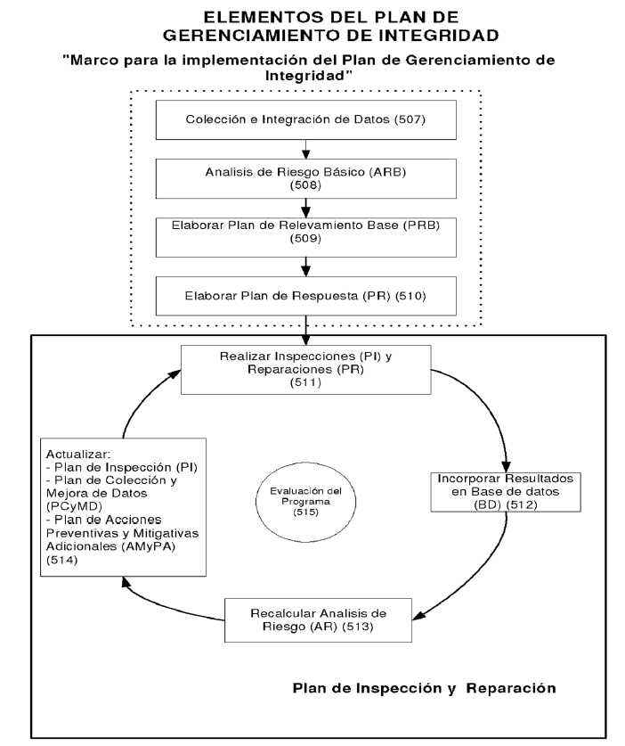 A 463.1 Instalaciones nuevas CAPITULO X [ A ]: PLAN DE GERENCIAMIENTO DE INTEGRIDAD PARTE 1: INTRODUCCION Y OBJETIVOS 501 INTRODUCCION 501.1 Generalidades Esta sección describe un proceso para gerenciar la integridad de un sistema de transporte de hidrocarburos líquidos. Dicho proceso se describe en el gráfico "Elementos del Plan de Gerenciamiento de Integridad". Estos elementos en conjunto proveen la base para un plan de gerenciamiento de integridad comprensivo, sistemático e integrado. Las definiciones de la terminología utilizada en el presente Capítulo se encuentran en la sección 504. 501.2 Propósitos y Objetivos El objetivo del presente Capítulo de este Reglamento es que los operadores de sistemas de transporte de hidrocarburos líquidos por cañerías, implementen un Plan de Gerenciamiento de Integridad (PGI), que a través de la sistematización y análisis de la información, permita adecuar las prácticas de Operación y Mantenimiento, evitando la ocurrencia de derrames o fugas que puedan dañar a los empleados, al público en general, al ambiente y a otras instalaciones. Atento a ello, se requiere que dichos operadores desarrollen planes de integridad que contengan las siguientes acciones básicas: · Evaluación de los riesgos derivados de las amenazas existentes en los distintos tramos del sistema de cañerías.· Evaluación de la integridad de las cañerías, después de haber implementado el Plan de Relevamiento Base (PRB), al menos cada 5 años, mediante herramientas de Inspección Interna (II) o Prueba Hidráulica (PH).· Reparación de los defectos encontrados con tiempos de respuesta prescriptos según su severidad.· Implementación de Acciones Preventivas y Mitigativas Adicionales (APyMA) para Areas Sensibles (AS).· Informar a la Autoridad de Aplicación en forma periódica los planes a implementar en el ciclo anual próximo y los resultados del ciclo anual anterior y las desviaciones a los requerimientos que en el presente Reglamento se especifican.· Implementación de un Plan de Gerenciamiento de Integridad (PGI) que garantice el cumplimiento de las disposiciones de esta sección.501.3 Elementos del Plan de Gerenciamiento de Integridad (PGI) El PGI se implementará en distintas etapas, a saber: · Recopilar e integrar la información existente.· Elaborar un Análisis de Riesgo Básico (ARB).· Elaborar un Plan de Relevamiento Base (PRB).· Elaborar un Plan de Respuesta (PR).A partir de este punto, se inicia un ciclo anual o proceso continuo en el cual se implementarán las siguientes actividades planificadas: · Realizar las inspecciones planificadas (Inspección Interna (II), Prueba Hidráulica (PH) o cualquier otro medio que garantice un nivel de comprensión equivalente).· Realizar las reparaciones que surjan del resultado de las inspecciones.· Actualizar, integrar y revisar la información colectada.· Recalcular el riesgo con la experiencia acumulada del ciclo anterior.· Elaborar un Plan de Colección y Mejora de Datos (PCyMD).· Revisar el Plan de Inspección (PI) y el Plan de Acciones Preventivas y Mitigativas Adicionales (APyMA).§ Evaluar la efectividad del sistema.