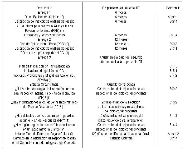 501.4 Requerimientos Generales del Plan de Gerenciamiento de Integridad (PGI) El operador deberá desarrollar y documentar los procedimientos de inspección, evaluación y reparación de los sistemas de transporte así como documentar el proceso que garantice la revisión y mantenimiento del PGI. A través del PGI se analizarán todas las amenazas aplicables a cada tramo de los sistemas de transporte alcanzado por el presente Reglamento. Se analizará toda la información disponible y se definirá un Plan de Colección y Mejora de Datos (PCyMD) para los tramos en que no se disponga de información con la calidad y cantidad acorde con las necesidades del PGI. La información que soporta al PGI (documentos y registros) deberá estar contenida en una base de datos. El operador deberá implementar un sistema de evaluación de riesgos Análisis de Riesgo (AR) que le permita desarrollar la planificación de las actividades de Integridad. Para las Areas Sensibles (AS) se implementarán Acciones Preventivas y Mitigativas Adicionales (APyMA) para minimizar el riesgo. El operador deberá desarrollar y documentar criterios y procedimientos para reparar los defectos que detecte mediante las inspecciones periódicas estipuladas en el presente Reglamento. Dichos defectos serán evaluados y de acuerdo a su condición de severidad serán clasificados como de reparación inmediata, con plazos de hasta 60 días ó 180 días. El PGI deberá ser revisado y actualizado en forma anual y un conjunto mínimo de información deberá ser presentado a la Autoridad de Aplicación en forma mandatoria. Se reportarán también un conjunto de indicadores de eficiencia de gestión. El presente Capítulo está íntimamente relacionado con el de Operación y Mantenimiento (Capítulo VII). En el PGI se indica el ¿qué? y el ¿cuándo?, mientras que el ¿cómo inspeccionar, mantener y reparar? debe estar incluido en el manual de Operación y Mantenimiento del operador. Ante un incidente el operador deberá presentar el Informe inmediato siguiendo los lineamientos indicados en la Resolución de la SECRETARIA DE ENERGIA Nº 24 del 12 de enero de 2004, o la normativa que la reemplace en el futuro. El Operador deberá presentar en el término de 120 días de ocurrido el incidente un Informe Final de Derrame, Fuga o Rotura que indicará claramente las causas que produjeron los mismos y los mecanismos de falla actuantes (ver Anexo 2). Se deberá elaborar y mantener actualizado un programa escrito de capacitación de personal propio y contratado que desarrolle las tareas inherentes a este Reglamento. El operador deberá establecer un organigrama que determine las responsabilidades que competen a las diferentes tareas a las que involucra el presente Reglamento. Asimismo deberá informar a la Autoridad de Aplicación quien será el Responsable Técnico e Interlocutor autorizado en lo referente a la implementación del PGI. Debiéndolo mantener actualizado ante cada cambio que se produzca. El cronograma de cumplimiento que se establece en el presente Capítulo es de carácter mandatario. 501.5 Principios Guía Existen ciertos principios que sostienen el desarrollo del presente Capítulo, los mismos se reflejan a lo largo de las distintas secciones y se describen a continuación con el objeto de mostrar un sentido más amplio de la integridad de las instalaciones. · La integridad debe ser constituida a partir del planeamiento, diseño y construcción. El gerenciamiento de la integridad de una cañería comienza con el diseño correcto y la construcción de la línea. Las guías mínimas para un correcto diseño se proveen en este Reglamento. El diseñador deberá contemplar las características del tipo de fluido e impacto sobre el ambiente que produciría una falla. El diseño no es parte de este capítulo, sin embargo las especificaciones de diseño e información conforme a obra proveerán una importante información de base para el PGI.· El PGI será desarrollado por personal capacitado, utilizando procesos definidos para operar y mantener las instalaciones. La integridad de una instalación física es solamente parte del sistema completo que permite al operador reducir tanto el número de incidentes así como los efectos que producen dichos incidentes. El sistema integral también incluye las personas que operan las instalaciones y el proceso de trabajo que los empleados usan y siguen. Un PGI debe comprender a las personas, procesos e instalaciones.· El PGI debe ser flexible. El programa debe estar hecho a la medida de las condiciones del sistema y del operador. Además, el programa debe ser evaluado y actualizado en forma continua incorporando los cambios en el diseño, operación, ambiente, obras de terceros o propias en las cercanías y las actualizaciones de la información de operación y mantenimiento. La evaluación continua es necesaria para asegurar que el programa toma las ventajas que ofrecen las nuevas tecnologías, que acompaña a las necesidades del negocio del operador y que efectivamente apunta a los objetivos planteados para la integridad.Los Operadores tienen muchas opciones para manejar los riesgos. Los componentes de las instalaciones pueden ser cambiados, se puede reforzar la capacitación del personal que opera el sistema, se pueden cambiar los procesos o procedimientos o implementar la combinación de actividades que provea el mayor impacto sobre la reducción del riesgo. · La integración de la información es un elemento clave para manejar la integridad del sistema. Para el proceso de decisión de las actividades de gerenciamiento de integridad es fundamental la integración de la información disponible. La información que puede impactar en el entendimiento de los riesgos más importantes a la integridad de los sistemas puede provenir de las más variadas fuentes. El operador es quien está en la mejor posición para colectar y analizar dicha información. Integrando esa información es que podrá 