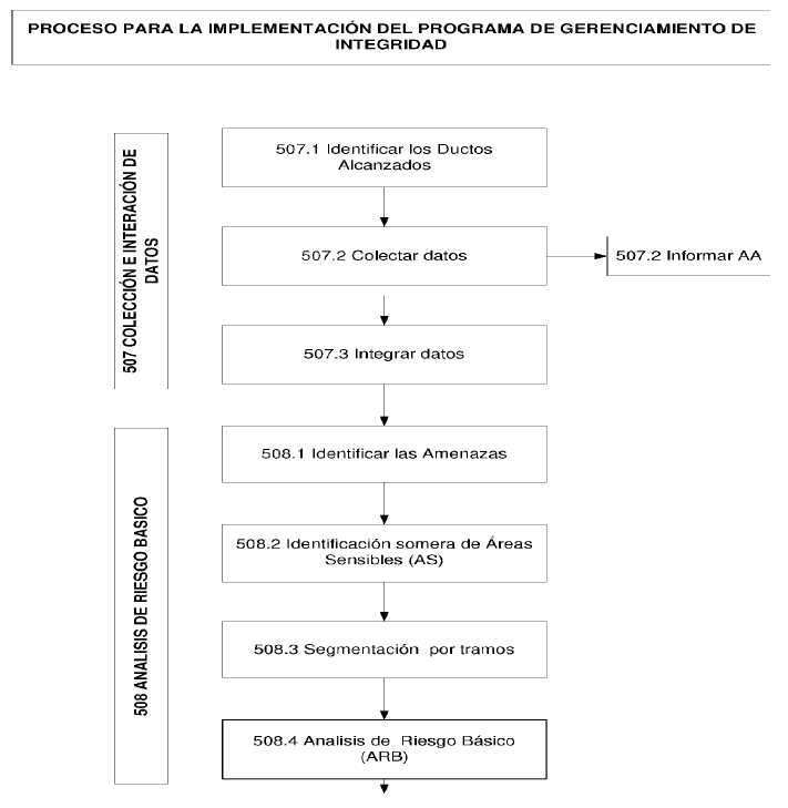 NOTA (1): Se enviará a la Autoridad de Aplicación un resumen, preferentemente de no más de dos carillas con la información requerida. NOTA (2): Se enviará a la Autoridad de Aplicación un listado con la información mínima necesaria para comunicar la información requerida. NOTA (3): Se enviará a la Autoridad de Aplicación el "Resumen Ejecutivo" del Informe Final de Derrame, Fuga o Rotura. La documentación y registros de respaldo de la información permanecerán en poder del operador, pero debe estar disponible ante cualquier requerimiento de la Autoridad de Aplicación. PARTE 3: PROCESO DE IMPLEMENTACION DEL PLAN DE GERENCIAMIENTO DE INTEGRIDAD 507 COLECCION E INTEGRACION DE DATOS 507.1 Identificar Ductos Alcanzados El operador debe identificar todas las líneas de cañerías incluidas en el alcance de este documento. 507.2 Colectar datos El operador debe colectar toda la información disponible para comenzar con el desarrollo del PGI. El operador deberá presentar a la Autoridad de Aplicación los Datos Básicos solicitados en el Anexo 1 del presente Reglamento. Ante el desconocimiento de alguno de los datos el operador deberá adoptar el valor más conservador. 507.3 Integrar Datos El operador deberá desarrollar e implementar un proceso de colección y de integración de datos que permita obtener y manejar en forma sistemática la información antes requerida para cada uno de los tramos de su sistema. Deberá desarrollarse un sistema de referenciamiento común (en unidades consistentes) a efectos de permitir que todos los datos colectados puedan ser analizados para una misma localización. El sistema elegido para integrar los datos debe estar georreferenciado. El error inherente al método desarrollado para la integración de los datos debe ser compatible con el método de Análisis de Riesgo (AR) que se adopte. 508 CONTENIDOS DEL ANALISIS DE RIESGO BASICO (ARB) 508.1 Identificación de las amenazas aplicables El operador debe analizar para cada tramo alcanzado por el presente RT la aplicabilidad de cada una de las siguientes amenazas: a - Dependientes del tiempo transcurrido: a1 - Corrosión interna. a2 - Corrosión externa. a3 - Stress Corrosion Cracking (SCC). a4 - Fatiga. b - Estáticas o residentes: b1 - Defectos de fabricación en caño y accesorios: - Soldadura longitudinal. - Cuerpo del caño y material. b2 - Construcción: - Soldaduras circunferenciales defectuosas. - Soldaduras defectuosas. - Curvas con arrugas o pliegues. - Roscas y cuplas defectuosas. b3 - Equipamiento: - Fallas en juntas, empaquetaduras y retenes. - Fallas en equipos y dispositivos de alivios. - Fallas en sellos de bombas y empaquetaduras. - Misceláneos. c - Independientes del tiempo: c1 - DPT (daños mecánicos): - Daños ocasionados por primeras (personal del operador), segundas (personal contratado por el operados) o terceras (personal ajeno al operador) partes con consecuencias instantáneas. - Idem anterior con modo de manifestación retardada. - Vandalismo. c2 - Operación incorrecta: - Procedimientos de operación incorrecta. c3 - Fuerzas externas relacionadas con el clima: - Tiempo extremadamente frío. - Descargas atmosféricas. - Lluvias copiosas o inundaciones. - Movimientos del suelo. 508.2 Identificación somera de Areas Sensibles (AS) El operador deberá identificar las zonas donde las cañerías alcanzadas por el presente Reglamento cruzan Areas Sensibles (AS). En esta etapa del proceso de implementación del PGI podrá hacer una identificación somera de las Areas Sensibles (AS), ya que es esperable que no cuente con la información detallada necesaria para un análisis exhaustivo. 508.3 Segmentación por tramos Una división en tramos apropiada permitirá asignar los recursos de mantenimiento en una forma más eficiente. 508.4 Análisis de Riesgo Básico (ARB) El Operador debe seleccionar un método de Análisis de Riesgo (AR) apropiado para su sistema y para el PGI. En esta etapa basta con un método que permita priorizar en forma somera las actividades de inspección para la elaboración del Plan de Relevamiento Base (PRB). El ARB debe ser conducido, como mínimo, para cada uno de los tramos incluidos en el alcance del presente Reglamento. En el proceso deben considerarse todas las amenazas posibles. En esta etapa se deberá asumir mucha de la información que requiere el método de Análisis de Riesgo (AR), lo cual dependerá de la calidad y cantidad de datos de que disponga el operador. El objetivo de esta primera corrida de análisis de riesgo es establecer las bases técnicas y prioridades para la elaboración del Plan de Relevamiento Base (PRB).