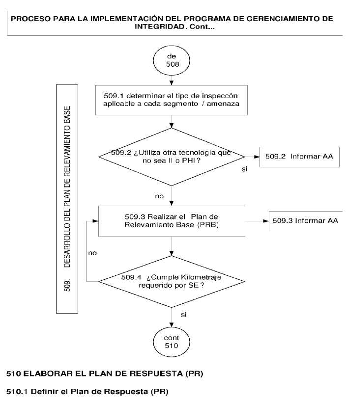509 ELABORAR EL PLAN DE RELEVAMIENTO BASE (PRB) 509.1 Determinar el tipo de inspección aplicable a cada tramo / amenaza Basado en el modo más probable de falla identificado en los pasos anteriores para cada tramo el operador debe establecer el o los métodos de inspección que utilizará para conocer la situación del tramo en cuestión. Los métodos aceptados para inspeccionar las líneas son: · Inspección Interna (II) mediante scraper inteligente.· Prueba Hidráulica (PH) de integridad .· Otro método que proporcione un conocimiento equivalente de la situación de los defectos yacentes en el tramo de la cañería.Para la correcta selección de la herramienta de inspección adecuada se recomienda el uso de la Recomendación Práctica NACE RP 0102 "Standad Recomendad Practice In Line Inspection of Pipeline". 509.2 Utilización de otra tecnología que no sea Inspección Interna (II) o Prueba Hidráulica (PH) Si el operador decidiera utilizar una tecnología que no fuera Inspección Interna (II) o Prueba Hidráulica (PH) para evaluar los efectos de una amenaza, deberá enviar a la Autoridad de Aplicación con 90 de anticipación a la presentación del Plan de Relevamiento Base (PRB) o Plan de Inspección (PI), según corresponda, la documentación técnica que justifique que dicha tecnología provee un nivel de comprensión de la amenaza a evaluar, que resulta equivalente a la Inspección Interna (II) o a la Prueba Hidráulica (PH). 509.3 Realizar el Plan de Relevamiento Base (PRB) El operador debe establecer un Plan de Relevamiento Base (PRB) basado principalmente en los resultados del ARB, enfocando sus esfuerzos en los tramos con mayor riesgo. El Plan de Relevamiento Base (PRB) deberá contemplar el tiempo desde la última inspección, si es que la hubiera, y los resultados de la misma. El Plan de Relevamiento Base (PRB) debe incluir el método y el cronograma de inspección para cada tramo de acuerdo a las amenazas antes identificadas. Se podrán tomar en cuenta consideraciones prácticas (inspeccionar diámetros iguales o realizar Prueba Hidráulica (PH) en tramos contiguos etc.), no obstante los tramos de mayor riesgo deben ser inspeccionados primero. 509.4 Kilometraje requerido por la Autoridad de Aplicación En el Plan de Relevamiento Base (PRB) el operador se debe comprometer a inspeccionar, primero, de acuerdo a los resultados del Análisis de Riesgo (AR), los tramos de mayor riesgo: Al menos el 50% de los tramos incluidos en el Plan de Relevamiento Base (PRB) deberán ser completados antes del año 5 de publicado el presente Reglamento, debiéndose completar al menos un 10% anualmente. El 50% de los tramos restantes incluidos en el Plan de Relevamiento Base (PRB) deberán ser completados antes del año 9 de publicado el presente Reglamento Técnico (RT), debiéndose completar al menos un 10% anual. Los porcentajes se miden en longitud inspeccionada sobre longitud total de cañerías alcanzadas por el presente RT.