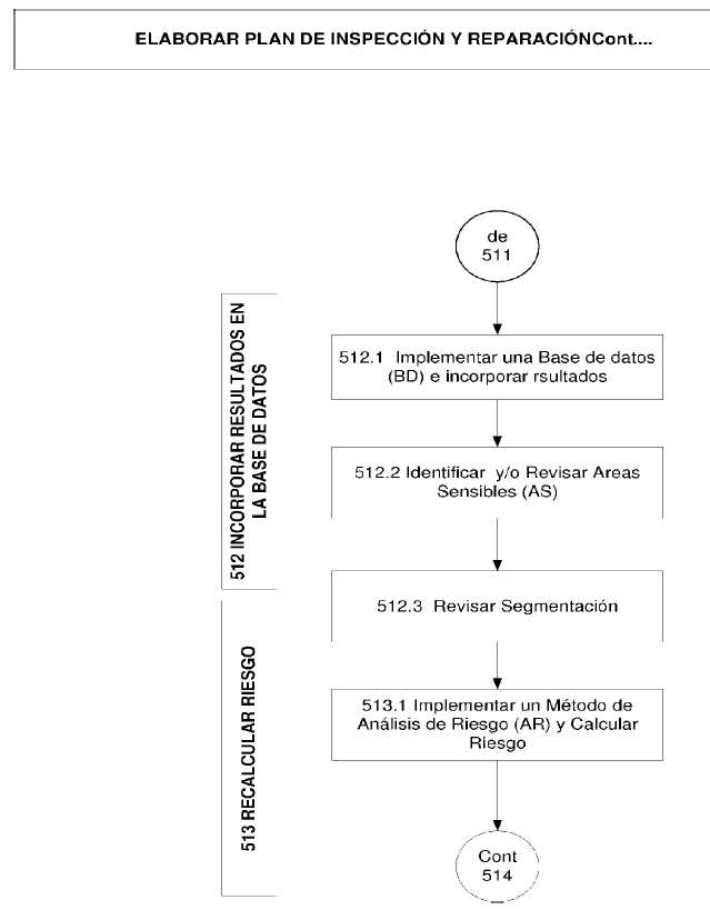 512 INCORPORAR RESULTADOS EN LA BASE DE DATOS 512.1 Implementar una Base de Datos (BD) e incorporar los datos y resultados Los datos constructivos de los tramos, los resultados de las inspecciones, los resultados de las evaluaciones directas, las conclusiones de las reparaciones, los informes de falla, los datos medioambientales y su sensibilidad, los datos de población deberán ser integrados, contenidos y actualizados en forma continua, en una única base de datos. Para los operadores que no tengan desarrollado una base de datos consistente al nivel de las exigencias del PGI se propone el uso de los formatos estandarizados a nivel internacional, compatibles con los programas comerciales de Análisis de Riesgo (AR) y con los GIS (Global Information System). Los operadores que ya cuenten con una Base de Datos (BD) consistente y acorde a las exigencias del PGI exigido por el presente Reglamento, podrán seguir utilizándola, previa demostración de su aptitud para el análisis y soporte de los datos. 512.2 Identificar y / o revisar las Areas Sensibles (AS) El operador identificará las Areas Sensibles (AS) por donde cruzan los cañerías. Asimismo, debe implementar un proceso para determinar y revisar cuales son los tramos que pueden afectar dichas Areas Sensibles (AS). La revisión deberá focalizarse en los cambios poblacionales y/o geomorfológicos y conclusiones que pueda obtener en base a la mejora del conocimiento de la traza de las cañerías. 512.3 Revisar Segmentación El operador deberá revisar la segmentación en tramos de acuerdo a las modificaciones a las instalaciones, a la información referente a las Areas Sensibles (AS), o por decisión de optimizar el proceso. Si se optara por una nueva segmentación, deberá ser incorporada en el PGI. 513 RECALCULAR EL RIESGO 513.1 Implementar un método de Análisis de Riesgo (AR) y calcular Riesgo El operador debe seleccionar e implementar un método de Análisis de Riesgo (AR) apropiado para su sistema y el PGI. En esta etapa debe seleccionar un método que permitirá al menos: · Analizar e integrar la información de las evaluaciones e inspecciones.· Analizar e integrar la información correspondiente a las Areas Sensibles (AS).· Analizar las consecuencias potenciales de un derrame, sobre las personas y el ambiente en función del tipo de producto y características de diseño y operación del tramo.· Calcular el riesgo como el producto de una probabilidad de falla multiplicado por una valoración de las consecuencias.· Administrar y presentar la información de salida (resultados) en forma analítica y gráfica.· Importar los datos de las instalaciones, inspecciones, coordenadas, etc. de la Base de Datos (BD).· Exportar las salidas de las corridas del Análisis de Riesgo (AR) permitiendo la trazabilidad de los datos utilizados como reales y los datos supuestos para la generación de escenarios de análisis.· Se deben considerar todas las amenazas posibles para cada tramo en el proceso del Análisis de Riesgo (AR), y en el evaluación de las consecuencias considerar el tipo de producto transportado.· El Análisis de Riesgo (AR) debe ser conducido para cada uno de los tramos incluidos en el alcance de este Reglamento.En cada ciclo el operador deberá evaluar las salidas del Análisis de Riesgo (AR) con el objetivo de establecer las bases técnicas y prioridades para la elaboración y actualización del Plan de Inspección (PI) y del Plan de Colección y Mejora de Datos (PCyMD). En base a la experiencia del personal técnico y especialistas, se ponderarán las conclusiones que surjan del Análisis de Riesgo (AR). Una vez que ha alcanzado cierta madurez la Base de Datos (BD) y los algoritmos de ponderación, el Análisis de Riesgo (AR) es una herramienta que permite tener una visión global del estado de riesgo del sistema, sin embargo no libera al operador de la responsabilidad de revisar las salidas del Análisis de Riesgo (AR), permitiendo así el uso del sentido común y las buenas reglas de la ingeniería. Una vez actualizada la base Base de Datos (BD) se realizará una corrida del Análisis de Riesgo (AR) y con los resultados de la misma se priorizarán nuevamente los tramos según su riesgo global. Se deberá revisar con la nueva información disponible la aplicabilidad de las amenazas para cada tramo, en los casos que corresponda. El operador decidirá qué tipo de Análisis de Riesgo (AR) desea implementar, cualitativo (basado en comparaciones relativas) o cuantitativo (basado en probabilidades concretas de falla y en alcances de consecuencias simuladas). Cada uno trae aparejado sus características, un análisis cualitativo permitirá priorizar los segmentos en cuanto al riesgo global (ponderando cada una de las amenazas y escenarios de consecuencias), mientras que uno cuantitativo le permitirá calcular la probabilidad de que un defecto —del cual se conocen detalladamente sus características— produzca una falla. En el análisis cuantitativo se requiere de más y mejor información, mayor precisión en la integración de los datos, mejor capacitación del personal a cargo de realizar las tareas de evaluación de los defectos, de la cartografía y del software del Análisis de Riesgo (AR) adoptado. A cambio de estas mayores exigencias podrá administrar situaciones de mayor compromiso en lo referente a la integridad del sistema.