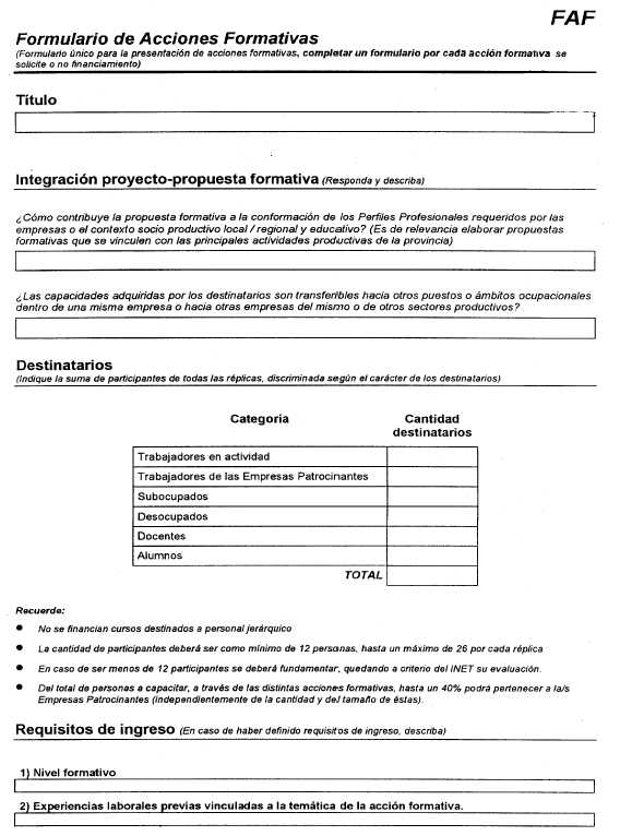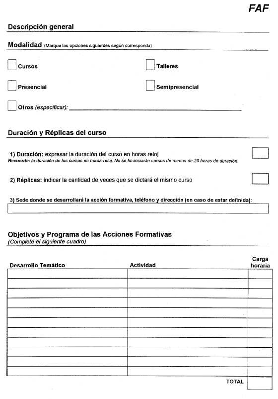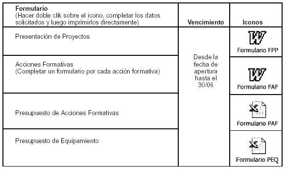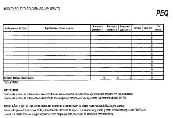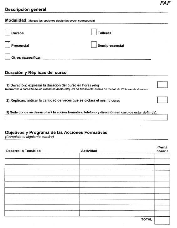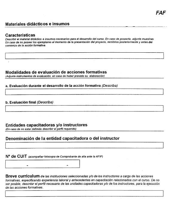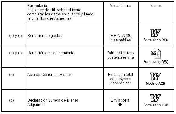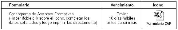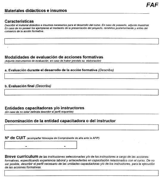 3.6. ¿Una vez aprobado el proyecto, existen plazos para la adquisición del equipamiento financiado? El plazo para la adquisición de equipamiento será de 150 días corridos contados a partir de la fecha de publicación en el Boletín Oficial de la Resolución de asignación del beneficio. 3.7. ¿Existen también plazos y condiciones para las acciones formativas financiadas? Se deberá informar mediante el siguiente formulario, las fechas de realización de las acciones formativas, sede, horarios y docente a cargo, 10 días hábiles antes del inicio de las mismas con el objetivo de posibilitar su seguimiento y supervisión, adjuntando el currículum de los instructores y/o de las instituciones contratadas a tal efecto y fotocopia del CUIT (si no lo hubieran hecho anteriormente).