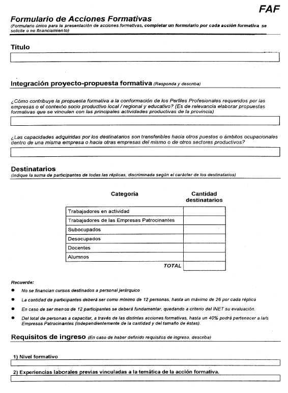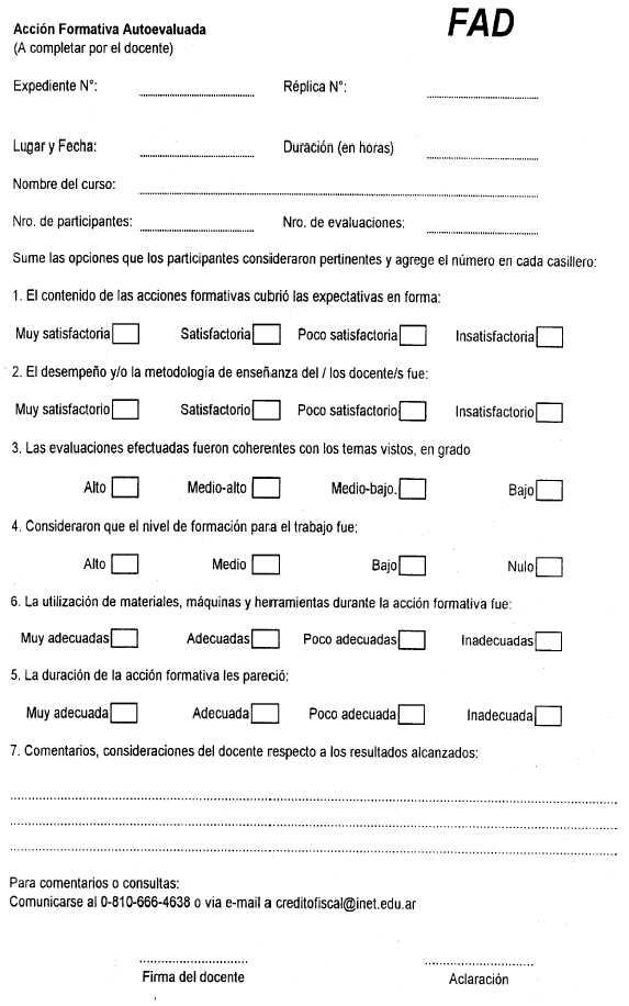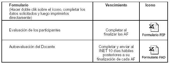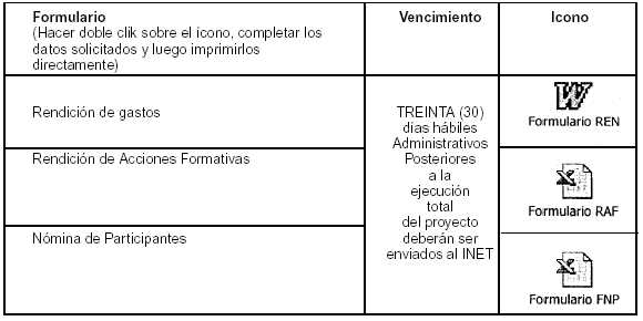 Las acciones formativas previstas en el Proyecto deberán ser ejecutadas dentro de los 12 meses contados a partir de la fecha de publicación en el Boletín Oficial de la Resolución de asignación del beneficio. Al finalizar cada una de las acciones formativas, deberá remitirse al INET dentro de un plazo de 10 días hábiles, el formulario FAD con el resumen de las evaluaciones de los participantes, debiendo quedar en poder del establecimiento las encuestas individuales que corresponden al formulario FEP, por el término de un año.