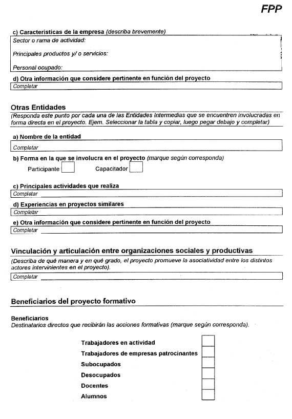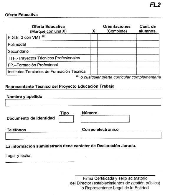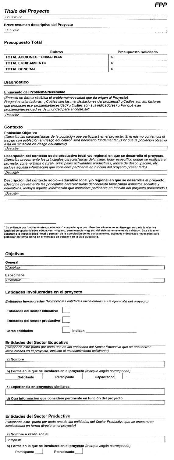 II. El financiamiento de proyectos 2.1. ¿Quiénes pueden solicitar financiamiento? Los proyectos deberán ser presentados por los Establecimientos del sistema educativo, de gestión pública o privada, que brinden EGB3 con espacios de vinculación al mundo del trabajo (VMT) y/o cualquier oferta curricular complementaria, educación media técnica y agrotécnica, polimodal con trayectos técnicos profesionales, educación de adultos, formación profesional y/o equivalentes, reconocidos por la autoridad educativa competente, y tecnicaturas de nivel superior no universitario, comprendidas en el Capítulo V, artículos 18 y 20, de la Ley Nº 24.521 de Educación Superior. Solamente se financiarán acciones formativas y adquisición de equipamiento que no impliquen la duplicación de subsidios, sean éstos de fuente pública o privada. Para solicitar el financiamiento, deberán primero completar los datos actualizados de los participantes en los siguientes formularios: