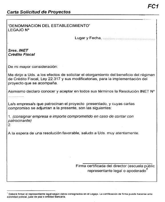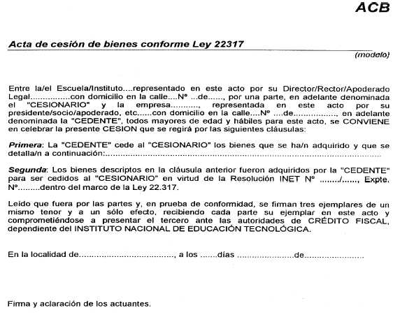 Bs. As., 22/4/2004 VISTO la Ley N° 22.317 y sus modificatorias N° 23.653, N° 24.624 y la Ley N° 25.827 relativas al Régimen de Crédito Fiscal en el ámbito del INSTITUTO NACIONAL DE EDUCACION TECNOLOGICA del MINISTERIO DE EDUCACION, CIENCIA Y TECNOLOGIA, la Ley Nº 25.300 de Fomento de las MiPyMEs, la Decisión Administrativa Nº 94/04 y CONSIDERANDO: Que resulta necesario establecer el procedimiento para la administración del Régimen de Crédito Fiscal de la Ley N° 22.317, conforme el cupo anual establecido por la Ley N° 25.827 de Presupuesto General de la Administración Nacional para el ejercicio 2004 y la Decisión Administrativa Nº 94/04. Que para ello, se han tenido en cuenta las experiencias recogidas durante los años 1999, 2001 y 2003, así como los consensos generados en el ámbito del CoNE-T (CONSEJO NACIONAL EDUCACION TRABAJO), órgano de consulta y asesoramiento en la materia, en cumplimiento de lo establecido por el Decreto Nº 606/95. Que el Decreto N° 1895/02, dispone expresamente que la Dirección Ejecutiva del INSTITUTO NACIONAL DE EDUCACION TECNOLOGICA, tiene la atribución de administrar el Régimen de la Ley N° 22.317 del Crédito Fiscal, y fijar en consecuencia el procedimiento a tal fin. Que la Jefatura de Gabinete de Ministros, por Decisión Administrativa Nº 94/04, ha fijado el importe a administrar por este INSTITUTO dependiente del MINISTERIO DE EDUCACION, CIENCIA Y TECNOLOGIA en la suma de CINCO MILLONES DE PESOS ($ 5.000.000). Por ello, LA DIRECTORA EJECUTIVA DEL INSTITUTO NACIONAL DE EDUCACION TECNOLOGICA RESUELVE: Artículo 1° — Aprobar el Procedimiento para la Presentación, Evaluación, Asignación y Rendición de Proyectos de Educación Trabajo, en el marco del Régimen de Crédito Fiscal de la Ley N° 22.317, para la asignación del cupo anual previsto por la Ley N° 25.827 y Decisión Administrativa Nº 94/04, para el ejercicio 2004, y que como Anexo I, forma parte integrante de la presente Resolución. Art. 2° — Comuníquese, publíquese, dése a la Dirección Nacional del Registro Oficial y archívese. — María R. Almandoz.
