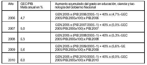 Donde: Ÿ GEC: Gasto consolidado en educación, ciencia y tecnología.Ÿ PIB: Producto Interno Bruto.Ÿ GEN: Gasto en educación, ciencia y tecnología del Gobierno nacional.Ÿ 40% = Participación del Gobierno nacional en el esfuerzo de inversión adicional para el cumplimiento de la Meta de crecimiento anual de GEC/PIB.El Gobierno nacional financiará con sus recursos los programas destinados a cumplir los objetivos especificados en los incisos j) y k) del artículo 2° de la presente ley en lo atinente a instituciones y organismos dependientes del Estado nacional. La distribución de los recursos incrementales de jurisdicción nacional destinados a la educación no universitaria, universitaria y el sistema científico-tecnológico deberá realizarse conforme a las participaciones actuales del Gasto Educativo Consolidado del año 2005. ARTICULO 5º — A fin de lograr el cumplimiento de los objetivos descriptos en el artículo 2° de la presente ley, el gasto consolidado en educación, ciencia y tecnología de las provincias y de la Ciudad Autónoma de Buenos Aires se incrementará anualmente —respecto del año 2005—, de acuerdo a los porcentajes que se consignan en el siguiente cuadro: