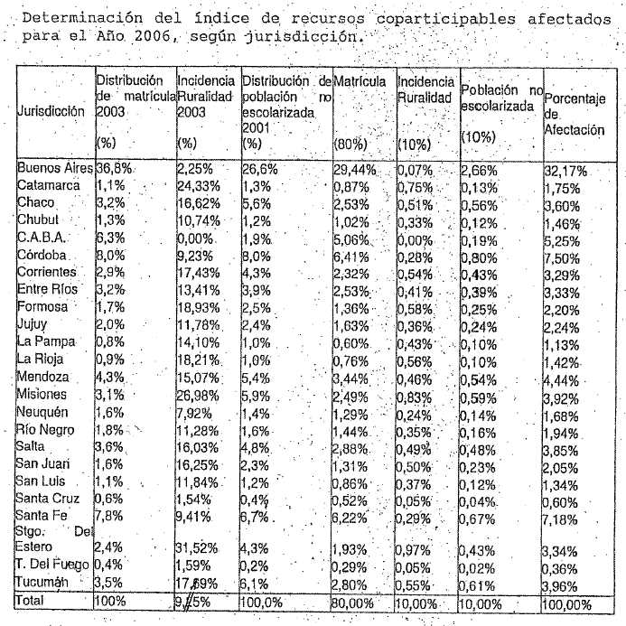 Donde: Ÿ GEC: Gasto consolidado en educación, ciencia y tecnología.Ÿ PIB: Producto Interno Bruto.Ÿ GEP: Gasto en educación, ciencia y tecnología de las provincias y Ciudad Autónoma de Buenos Aires.Ÿ 60% = Participación de los Gobiernos provinciales y de la Ciudad Autónoma de Buenos Aires en el esfuerzo de inversión adicional para el cumplimiento de la meta de crecimiento anual de GEC/PIB.Este incremento se destinará prioritariamente a: i) mejorar las remuneraciones docentes, ii) adecuar las respectivas plantas orgánicas funcionales a fin de asegurar la atención de una matrícula creciente, iii) jerarquizar la carrera docente garantizando su capacitación con el objeto de mejorar la calidad educativa. ARTICULO 6º — A los efectos de los cálculos previstos en los artículos 4° y 5° de la presente ley, se utilizará el Producto Interno Bruto contemplado en la presentación del proyecto de Ley de Presupuesto de la Administración Nacional. En los ejercicios fiscales en donde no haya incremento en el PIB o cuando la variación del mismo no genere el incremento en la recaudación exigible para alcanzar las metas financieras previstas, la meta anual deberá adecuarse proporcionalmente al incremento de la recaudación. Podrán las partes, de común acuerdo, en cada convenio bilateral redefinir plazos, condiciones y alcances de los compromisos asumidos. ARTICULO 7º — Establécese, por el plazo de CINCO (5) años, una asignación específica de recursos coparticipables en los términos del inciso 3 del artículo 75 de la Constitución Nacional con la finalidad de garantizar condiciones equitativas y solidarias en el sistema educativo nacional, y de coadyuvar a la disponibilidad de los recursos previstos en el artículo 5° de la presente ley en los presupuestos de las Provincias y de la Ciudad Autónoma de Buenos Aires. Será objeto de tal afectación el incremento, respecto del año 2005, de los recursos anuales coparticipables correspondientes a las provincias y a la Ciudad Autónoma de Buenos Aires en el Régimen de la Ley N° 23.548 y sus modificatorias y complementarias. El monto total anual de la afectación referida será equivalente al SESENTA POR CIENTO (60%) del incremento en la participación del gasto consolidado en educación, ciencia y tecnología en el Producto Interno Bruto, según surge del segundo sumando del cuadro del artículo 5° de la presente ley. ARTICULO 8º — La determinación del monto de la asignación específica correspondiente a cada provincia y a la Ciudad Autónoma de Buenos Aires a partir del monto total que surge de la aplicación del artículo anterior, se efectuará conforme a un índice que se construirá anualmente en función de los siguientes criterios: a) La participación de la matrícula de cada provincia y de la Ciudad Autónoma de Buenos Aires en el total de los niveles inicial a superior no universitario, correspondiente a todos los tipos de educación (ponderación OCHENTA POR CIENTO (80%). b) La incidencia relativa de la ruralidad en el total de la matrícula de educación común de cada provincia y de la Ciudad Autónoma de Buenos Aires (ponderación DIEZ POR CIENTO (10%). c) La participación de la población no escolarizada de TRES (3) a DIECISIETE (17) años de cada Provincia y de la Ciudad Autónoma de Buenos Aires en el total (ponderación DIEZ POR CIENTO (10%). Para la determinación anual del índice de contribución será de aplicación obligatoria la información suministrada por: 1) la DIRECCION NACIONAL DE INFORMACION Y EVALUACION DE LA CALIDAD EDUCATIVA del MINISTERIO DE EDUCACION, CIENCIA Y TECNOLOGIA en su relevamiento anual para los criterios a y b, y 2) el INSTITUTO NACIONAL DE ESTADISTICA Y CENSOS del MINISTERIO DE ECONOMIA Y PRODUCCION para el criterio c. En este último caso, la información se referirá a los datos del último censo nacional disponible. En ningún caso se utilizarán datos de población no escolarizada que resulten de extrapolaciones a períodos posteriores al último censo nacional. La determinación de los importes afectados se realizará a los efectos de que cada jurisdicción refleje en su presupuesto anual el compromiso financiero derivado de la aplicación del artículo 5° de la presente ley. El índice que se aplicará para cada jurisdicción en el año 2006 será el que figura en el ANEXO I. Para los años siguientes, el MINISTERIO DE EDUCACION, CIENCIA Y TECNOLOGIA calculará y comunicará el referido índice para la elaboración del proyecto de Ley de Presupuesto de la Administración Nacional del respectivo año. ARTICULO 9º — Créase, en el ámbito del MINISTERIO DE EDUCACION, CIENCIA Y TECNOLOGIA, el Programa Nacional de Compensación Salarial Docente, cuyo objetivo será el contribuir a la compensación de las desigualdades en el salario inicial docente en aquellas provincias en las cuales se evalúe fehacientemente que, a pesar del esfuerzo financiero destinado al sector y de las mejoras de la eficiencia en la asignación de los recursos, no resulte posible superar dichas desigualdades. En la reglamentación de la presente ley, el Poder Ejecutivo nacional, con la participación del Consejo Federal de Cultura y Educación, fijará criterios de asignación tendientes a compensar las desigualdades existentes entre las diferentes jurisdicciones mediante un porcentaje de los recursos determinados en el artículo 4° que se destinarán al Programa Nacional de Compensación Salarial Docente, así como su operatoria y los requisitos que deberán cumplir las provincias y la Ciudad Autónoma de Buenos Aires para acceder a los recursos. ARTICULO 10º — El MINISTERIO DE EDUCACION, CIENCIA Y TECNOLOGIA juntamente con el Consejo Federal de Cultura y Educación y las entidades gremiales docentes con representación nacional, acordarán un convenio marco que incluirá pautas generales referidas a: a) condiciones laborales, b) calendario educativo, c) salario mínimo docente y d) ca