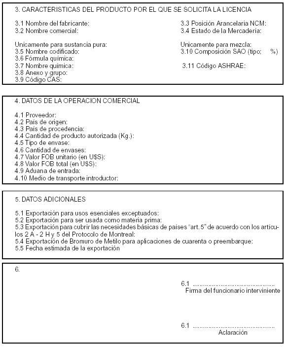 Anexo VII: Instructivo para la solicitud de licencia 1. Los interesados en realizar una solicitud de licencia deberán acceder a la pantalla de entrada al Sistema de Licencias SAO (por intermedio del link ubicado en la página web de la SECRETARIA DE AMBIENTE Y DESARROLLO SUSTENTABLE o bien escribiendo en la barra de direcciones de su explorador la dirección de la página de entrada). Una vez allí ingresarán utilizando el nombre de usuario y clave de acceso suministrados vía email al momento del alta. 2. Realizado el ingreso, el sistema mostrará el perfil (transacciones habilitadas) para el usuario. Seleccionando la opción "Solicitud de licencia" se accede a las pantallas que permiten cargar los datos de una solicitud. 3. Estas pantallas están divididas en dos marcos: el de la izquierda permite el ingreso de datos mientras que el de la derecha permite visualizar todos los datos cargados y proceder a su modificación si fuera necesario. 4. En la primera pantalla, en el marco de la izquierda, se presentan los datos del interesado que figuran en el registro del sistema y se presenta un menú desplegable para que se opte por el tipo de solicitud que se desea realizar. 5. A continuación se presenta una pantalla que permite ingresar las características del producto para el que se solicita licencia, debiendo indicarse: a) Nombre del fabricante b) Nombre comercial c) Posición Arancelaria d) Estado de la mercadería e) Si se trata de una sustancia pura o una mezcla (por medio de un menú desplegable) Si se elige "sustancia pura" la siguiente pantalla que se presenta permite ingresar los datos relativos a: f) Nombre codificado, el cual se selecciona por intermedio de un menú desplegable que contiene todos los nombres codificados de las sustancias controladas mencionadas en los Anexos V y VI de la presente resolución (automáticamente al realizar una selección de sustancia el sistema cargará y mostrará en pantalla la fórmula química y el nombre químico asociado así como el Anexo-Grupo del Protocolo de Montreal al cual pertenece la SAO) g) Código CAS Si se elige "mezcla" el sistema presentará una pantalla que permite ingresar los datos relativos a: h) Código ASHRAE (si lo tuviera). i) Nombre codificado del componente de la mezcla, el cual se selecciona por intermedio de un menú desplegable que contiene todos los nombres codificados de las sustancias controladas mencionadas en los Anexos V y VI de la presente resolución (automáticamente al realizar una selección de sustancia el sistema cargará y mostrará en pantalla la fórmula química y el nombre químico asociado así como el Anexo-Grupo del Protocolo de Montreal al cual pertenece la SAO). j) La parte porcentual del componente ingresado en la mezcla. k) Si la mezcla para la cual se solicita licencia tuviera más de un componente el solicitante podrá cargar los mismos por intermedio del link destinado a cargar otro componente de la mezcla. 6. A continuación el sistema permite cargar los datos de la operación comercial: a) Proveedor b) País de origen (para solicitudes de licencia de importación) o País de destino (para solicitudes de licencia de exportación) c) País de procedencia d) Cantidad de producto que se solicita autorizar, expresada en Kilogramos (Kg.) e) Tipo de envase f) Cantidad de envases g) Valor FOB unitario expresado en U$S h) Valor FOB total expresado en U$S i) Aduana de entrada (para solicitudes de licencia de importación) o Aduana de salida (para solicitudes de licencia de exportación) j) Medio de transporte introductor 7. Finalmente se presenta una pantalla para la carga de datos adicionales. Para el caso de solicitudes de licencia de importación éstos son: a) La indicación de si se trata una importación para uso crítico (esencial), la cual será seleccionable únicamente para aquellos importadores que hubieran sido habilitados para operar bajo tal modalidad. b) Uso final u objeto de la importación, el cual será seleccionable desde un menú desplegable. c) Domicilio de almacenaje del producto d) Fecha estimada de la importación Para el caso de solicitudes de licencia de exportación estos datos serán: e) Indicación de si se trata de una exportación para usos esenciales exceptuados f) Indicación de si se trata de una exportación para ser usada como materia prima g) Indicación de si se trata de una exportación para cubrir las necesidades básicas de países "art. 5" de acuerdo con los artículos 2ª-2H y 5 del Protocolo de Montreal h) Indicación de si se trata de una exportación de bromuro de metilo para aplicaciones de cuarentena o preembarque (esta opción se habilitará únicamente en caso que la sustancia elegida anteriormente hubiera sido bromuro de metilo). 1. Estas indicaciones se realizarán por intermedio de un menú desplegable que tiene únicamente dos opciones "SI" y "NO", encontrándose todas ellas configuradas en "NO" al acceder a la pantalla. En caso de que el solicitante no cuente con la información suficiente para realizar estas indicaciones deberá dejarlas en "NO". i. Fecha estimada de la exportación 8. Finalizada la carga de datos y aceptada la solicitud el sistema mostrará un mensaje de salida con la indicación de que el interesado recibirá un email en la dirección de correo electrónico especificada al momento de la registración para que pueda acceder al formulario de solicitud de licencia. El formato del email aludido será: Asunto: Trámite de solicitud de licencias de SAO Texto: Por medio del presente le hacemos llegar la confirmación del trámite de solicitud de licencia de SAO. Utilice el siguiente botón para acceder al formulario de solicitud que deberá guardar en su computadora e imprimir a fin de presentar ante las autoridades correspondientes. Ayuda: ¿Cómo visualizar e imprimir el formulario? Ayuda: ¿Cómo guardar el formulario en su computadora?