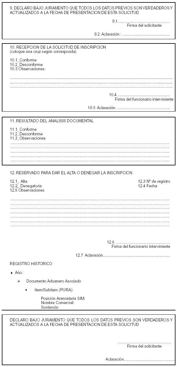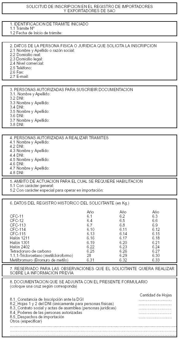 Este email ha sido enviado a su dirección de correo electrónico en respuesta a una transacción realizada con el Sistema de Licencias de Importación/Exportación de SAO. Si éste no fuera el caso elimine este email. 5. Los interesados que deben cargar sus antecedentes de importaciones (registro histórico de importaciones) deberán acceder nuevamente a la página de entrada al Sistema de Licencias SAO e introducir su nombre de usuario y clave de acceso que le fueran enviadas por mail. Una vez superada la pantalla de ingreso se presentará un menú con dos opciones "Ingreso de Registro Histórico" y "Cambio de Clave". Accionando en la primera de ellas se podrá comenzar el proceso de la carga. Al efecto el sistema presentará una pantalla de ayuda que guiará al interesado en el proceso. Una vez finalizada la carga y aceptada la información por el sistema se presentará una pantalla de salida con un mensaje que le informa al interesado que en breve recibirá en la dirección de correo electrónico detallada en el formulario electrónico de inscripción un email con un link para que pueda descargar el formulario de inscripción que deberá imprimir y presentar ante las autoridades que administran el sistema para proseguir el trámite de inscripción. Este email tendrá las mismas características que el señalado en el punto 4 (i) precedente. 6. A partir del email que contiene el link para acceder al formulario el interesado tendrá acceso a éste y deberá proceder a su impresión (al menos dos ejemplares), siguiendo las instrucciones de ayuda accesibles desde el link ubicado en el mismo email. 7. Si el interesado deseara introducir algún cambio en la información consignada en el formulario impreso o agregar información deberá hacerlo utilizando el campo Nº 7 del formulario destinado a tal fin. Si el espacio reservado no fuese suficiente podrá continuar en hoja aparte debidamente suscripta por la misma persona que suscribirá el formulario de inscripción dejando constancia de ello en el referido campo Nº 7. 8. El interesado dejará constancia de la documentación que adjuntará así como del número de hojas de la misma en el campo Nº 8 del formulario reservado a tal fin. 9. El interesado presentará dos impresiones del formulario de inscripción debidamente suscriptas, en el campo Nº 9 reservado para tal fin, junto con la documentación adicional señalada en el artículo 7º de la presente, y que fuera consignada en el campo Nº 8 del formulario, ante la DIRECCION NACIONAL DE GESTION AMBIENTAL. En caso de ser aceptada la solicitud de inscripción junto con la documentación adjunta el funcionario actuante dejará constancia de ello en el campo Nº 10 del formulario entregándole una copia al interesado para su constancia. En caso que del control realizado surgieran novedades que impidieran aceptar el formulario de inscripción con su documentación adjunta, para proseguir el trámite de inscripción en el RIESAO, el funcionario actuante dejará constancia de ello en el campo Nº 10 del formulario y devolverá una de las impresiones del formulario junto con la documentación adjunta al interesado para su perfeccionamiento, quedando en reserva de la Dirección el otro ejemplar del formulario. 10. Una vez aceptado el formulario de inscripción con la documentación adjunta la DIRECCION NACIONAL DE GESTION AMBIENTAL procederá al análisis de la información contenida en ellos y en caso de encontrarse la misma conforme procederá a dar de alta en el registro al interesado. El funcionario actuante dejará constancia del número de registro del interesado en el campo Nº 12 del formulario de inscripción. 11. Una vez que el interesado fue dado de alta recibirá en la dirección de correo electrónico que hubiere consignado en el formulario de inscripción un email donde se le indicará tal circunstancia y en el que se le informará su nombre de usuario y clave de acceso para que pueda realizar las correspondientes transacciones con el sistema de licencias. El email aludido tendrá las siguientes características: Asunto: Trámite de inscripción en el registro del sistema de licencias de SAO Texto: Por medio del presente le informamos que se ha completado su trámite de inscripción. Los datos a continuación corresponden a su nombre de usuario y clave de acceso para ingresar al sistema. Nombre de usuario: xxxxxxxxxxxxxx Clave de acceso: xxxxxxxxxx Ir al sitio web Este email ha sido enviado a su dirección de correo electrónico en respuesta a una transacción realizada con el Sistema de Licencias de Importación/Exportación de SAO. Si éste no fuera el caso elimine este email. 12. En caso que se denegara la inscripción en el registro el funcionario actuante dejará constancia de ello en el campo Nº 12 del formulario de inscripción. 13. Una vez que se denegó una inscripción en el registro el interesado recibirá en la dirección de correo electrónico que hubiere consignado en el formulario de inscripción un email donde se le indicará tal circunstancia. El email aludido tendrá las siguientes características: Asunto: Trámite de inscripción en el registro del sistema de licencias de SAO Texto: Por medio del presente le informamos que se ha denegado su solicitud de inscripción en el Registro de Sistema de Licencias SAO. Para mayor información comuníquese con personal de la Autoridad administradora del Sistema de Licencias SAO. Este email ha sido enviado a su dirección de correo electrónico en respuesta a una transacción realizada con el Sistema de Licencias de Importación/Exportación de SAO. Si éste no fuera el caso elimine este email.