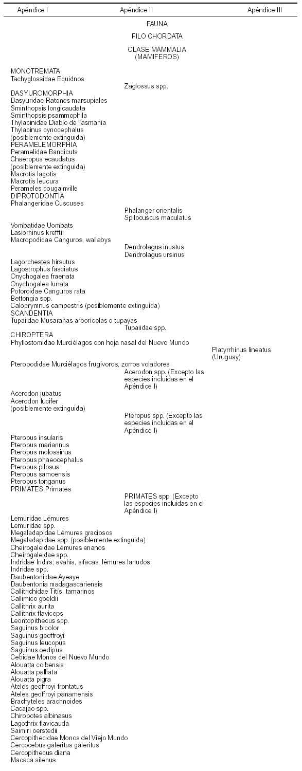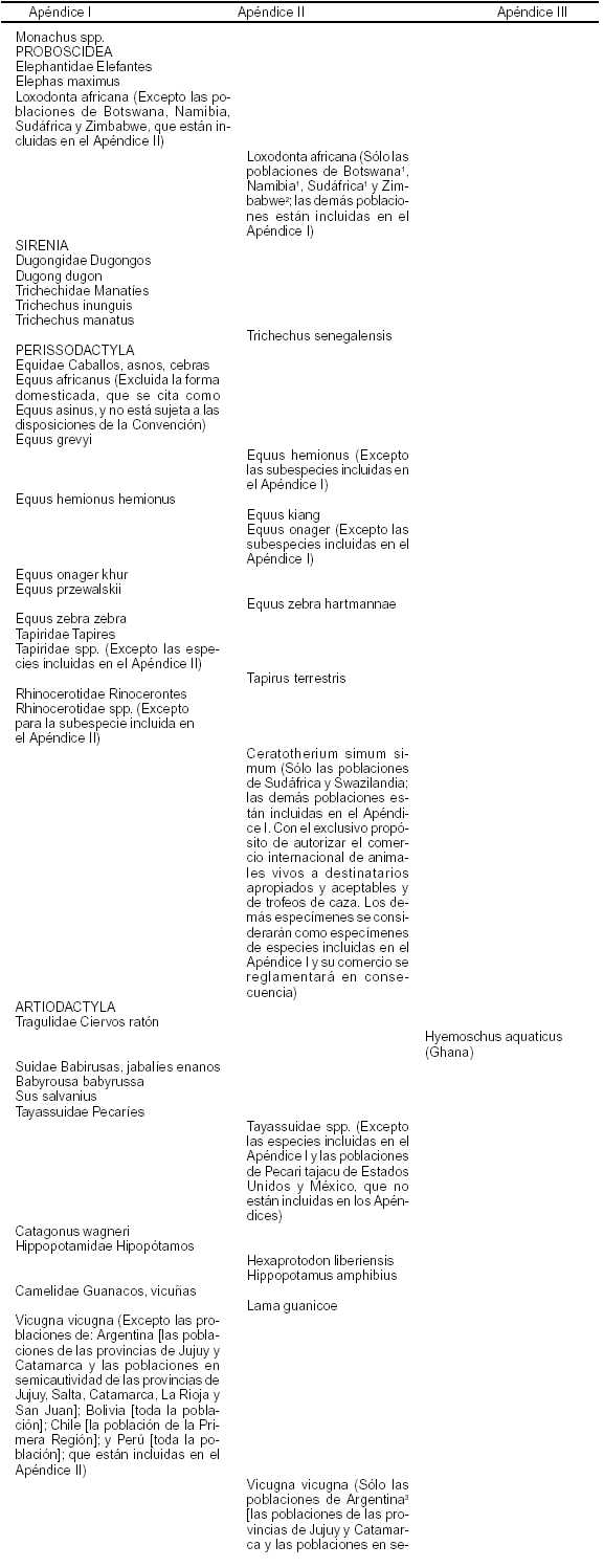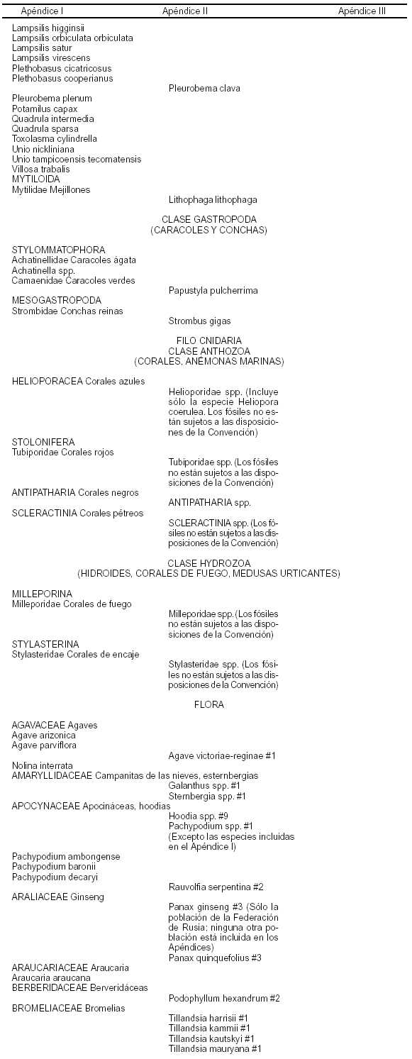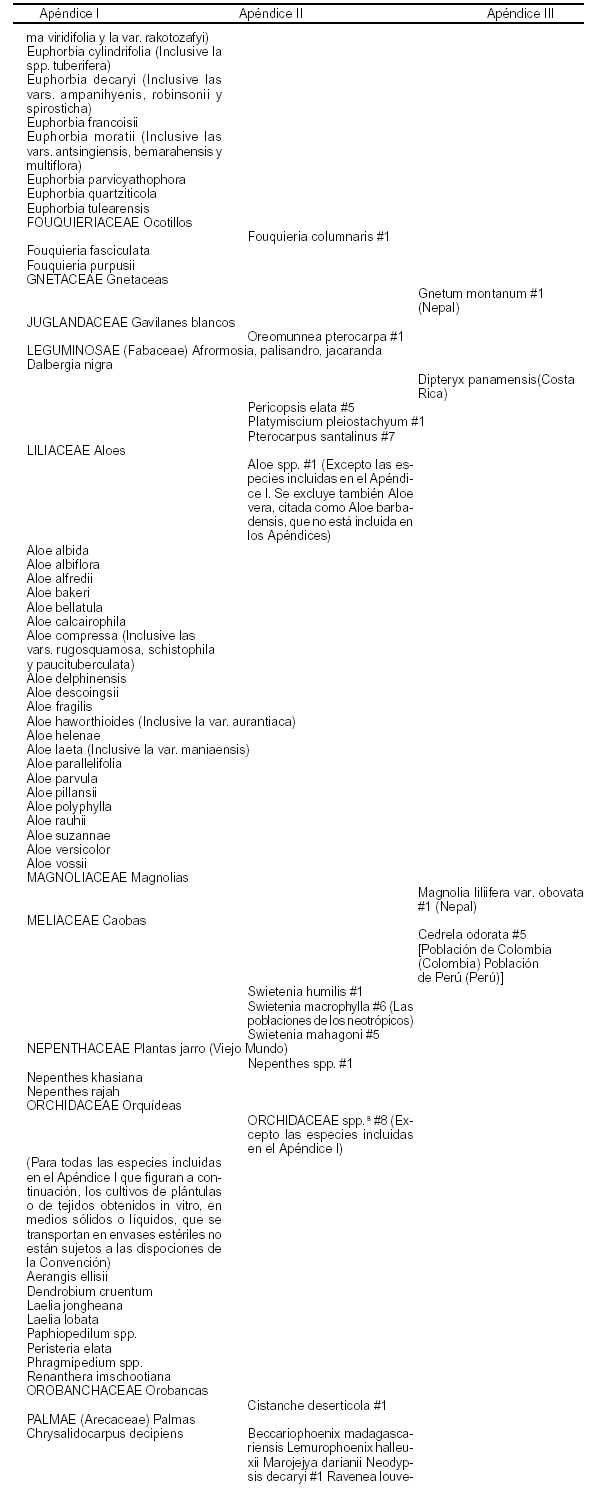 Bs. As., 1/3/2005 VISTO el expediente Nº 1-2002-5351000034/05-0 del registro de esta Secretaría de Ambiente y Desarrollo Sustentable, la Convención sobre el Comercio Internacional de Especies Amenazadas de Fauna y Flora Silvestres, aprobada por Ley Nº 22.344, su Decreto Reglamentario Nº 522 del 5 de junio de 1997, y CONSIDERANDO: Que la CONVENCION SOBRE EL COMERCIO INTERNACIONAL DE ESPECIES AMENAZADAS DE FAUNA Y FLORA SILVESTRE (CITES), a la cual la Argentina adhirió mediante la sanción de la Ley Nº 22.344, establece en su Artículo XV, (Enmiendas a los Apéndices) que en reuniones de la Conferencia de las Partes, las enmiendas adoptadas entrarán en vigor para todas las Partes noventa días después de la reunión, con la excepción de las Partes que formulen reservas. Que por el artículo 39 del Decreto Nº 522 del 5 de junio de 1997, reglamentario de, la mencionada Ley, se aprueba el listado de especies incluidas en los Apéndices I, II y III de la Convención sobre el Comercio Internacional de Especies Amenazadas de Fauna y Flora Silvestres (Ley Nº 22.344), que como Anexo I forma parte del mismo. Que con motivo de haberse llevado a cabo la Decimotercera Reunión de la Conferencia de las Partes en Bangkok, Tailandia, entre los días 2 y 14 de octubre de 2004, se han aceptado enmiendas a los Apéndices de la Convención, las cuales han entrado en vigor a partir del 12 de enero de 2005. Que el Decreto Nº 522/97, delega mediante su artículo 37 en la entonces SECRETARIA DE RECURSOS NATURALES Y DESARROLLO SUSTENTABLE de la PRESIDENCIA DE LA NACION la facultad de dictar las normas complementarias al presente decreto, así como la recepción de las Resoluciones que se aprueben en las Reuniones de la Conferencia de las Partes, y la aceptación de las modificaciones a los Apéndices, cuando el país no haya formulado reserva. Que ha tomado la intervención que le compete la DIRECCION GENERAL DE ASUNTOS JURIDICOS de la jurisdicción. Que el suscripto es competente para el dictado del presente acto en virtud de lo dispuesto por la Ley de Ministerios (T.O. por Decreto Nº 438/92, sus modificatorios y complementarios), Decreto Nº 2662 del 29 de diciembre de 1992, Decreto Nº 280 del 23 de febrero de 1995, Decreto Nº 357 de fecha 21 de febrero de 2002 y sus modificatorios; y Decreto Nº 295 de fecha 30 de junio de 2003. Por ello, EL SECRETARIO DE AMBIENTE Y DESARROLLO SUSTENTABLE RESUELVE: Artículo 1º — Apruébase el Anexo I de la presente resolución, por el cual se establecen las modificaciones a los Apéndices de la CONVENCION SOBRE EL COMERCIO INTERNACIONAL DE ESPECIES AMENAZADAS DE FAUNA Y FLORA SILVESTRE adoptadas en la Decimotercera Reunión de la Conferencia de las Partes realizada en Bangkok, Tailandia, entre los días 2 y 14 de octubre de 2004. Art. 2º — La presente resolución entrará en vigencia al día siguiente de su publicación en el Boletín Oficial. Art. 3º — Comuníquese, publíquese, dése a la Dirección Nacional del Registro Oficial y archívese. — Atilio A. Savino. ANEXO I (en vigor a partir del 12 de enero de 2005) Interpretación 1. Las especies que figuran en estos Apéndices se clasifican: a) con arreglo al nombre de las especies; o b) como si todas las especies estuviesen incluidas en un taxón superior o en una parte designada del mismo. 2. La abreviatura "spp." se utiliza para denotar todas las especies de un taxón superior. 3. Otras referencias a los taxa superiores de la especie se indican únicamente a título de información o de clasificación. Los nombres comunes que aparecen después de los nombres científicos de las familias se incluyen a título de referencia. Su finalidad es indicar la especie dentro de la familia de que se trate que está incluida en los Apéndices. En la mayoría de los casos no se trata de todas las especies de la familia. 4. Las abreviaturas siguientes se utilizan para taxa de plantas por debajo del nivel de especie: a) "spp." para denotar las subespecies; y b) "var(s)." para denotar la variedad (variedades). 5. Habida cuenta de que ninguna de las especies o taxa superiores de FLORA incluidas en el Apéndice I están anotadas, en el sentido de que sus híbridos sean tratados de conformidad con las disposiciones del Artículo III de la Convención, los híbridos reproducidos artificialmente de una o más de estas especies o taxa pueden comercializarse con un certificado de reproducción artificial, y las semillas, el polen (inclusive las polinias), las flores cortadas, los cultivos de plántulas o de tejidos obtenidos in vitro, en medios sólidos o líquidos, que se transportan en envases estériles de estos híbridos no están sujetos a las disposiciones de la Convención. 6. Los nombres de los países entre paréntesis colocados junto a los nombres de las especies incluidas en el Apéndice III son los de las Partes que solicitaron la inclusión de estas especies en ese Apéndice. 7. De conformidad con las disposiciones del párrafo b(iii) del Artículo I de la Convención, el signo (#) seguido de un número colocado junto al nombre de una especie o de un taxón superior incluido en el Apéndice II o III designa las partes o derivados provenientes de esa especie o de ese taxón y se indican como sigue a los efectos de la Convención: #1 designa todas las partes y derivados, excepto: a) las semillas, las esporas y el polen (inclusive las olinias); b) los cultivos de plántulas o de tejidos obtenidos in vitro, en medios sólidos o líquidos, que se transportan en envases estériles; y c) las flores cortadas de plantas reproducidas artificialmente; #2 designa todas las partes y derivados, excepto: a) las semillas y el polen; b) los cultivos de plántulas o de tejidos obtenidos in vitro, en medios sólidos o líquidos, que se transportan en envases estériles; c) las flores cortadas de plantas reproducidas artificialmente; y d) los derivados químicos y productos farmacéuticos acabados; #3 designa las raíces ente