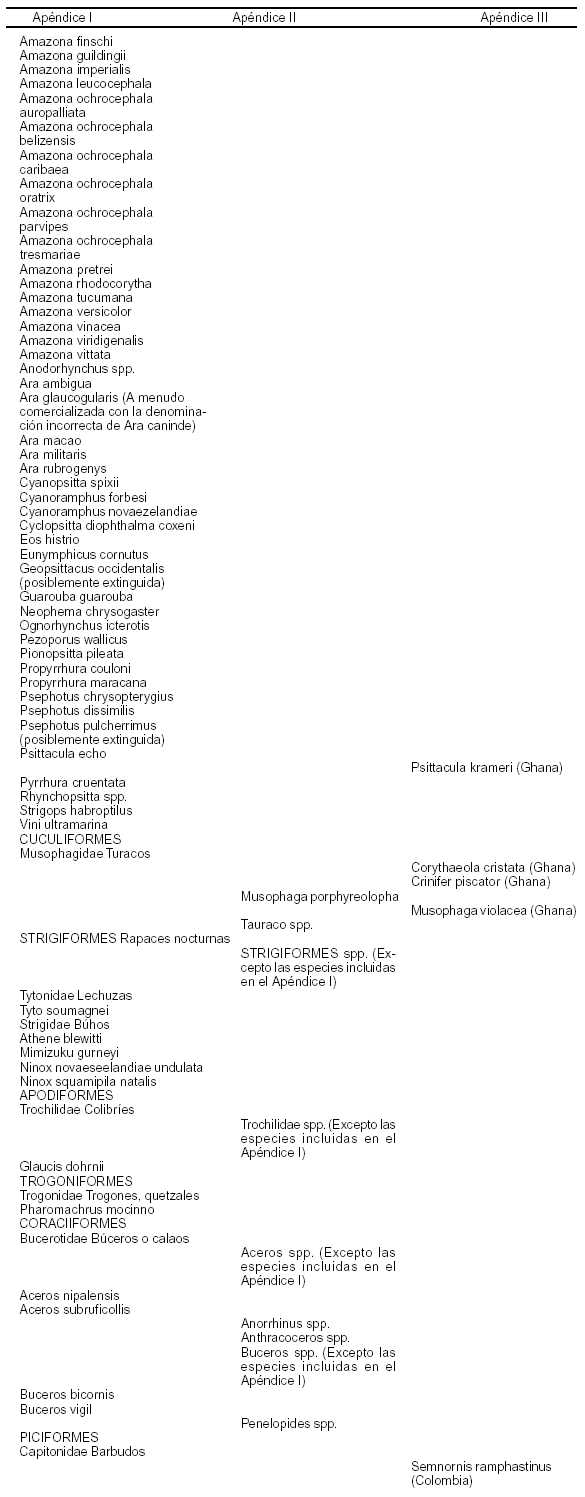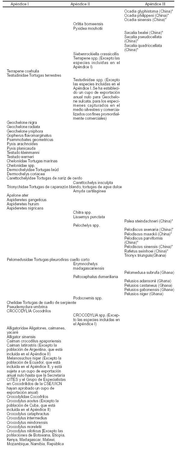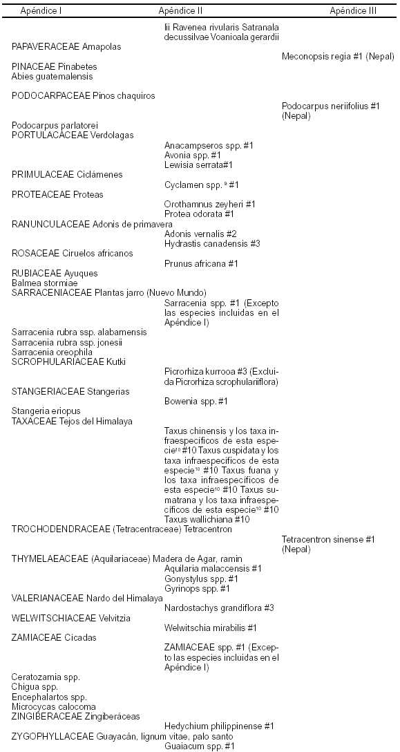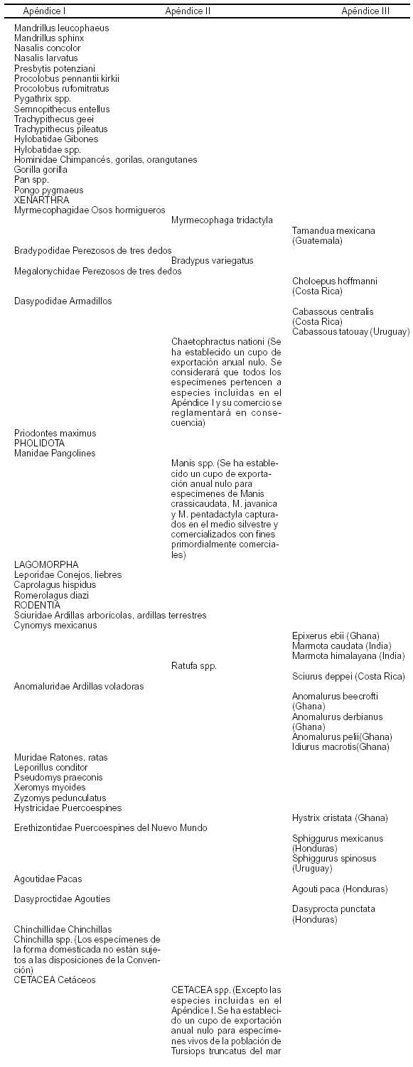 Bs. As., 1/3/2005 VISTO el expediente Nº 1-2002-5351000034/05-0 del registro de esta Secretaría de Ambiente y Desarrollo Sustentable, la Convención sobre el Comercio Internacional de Especies Amenazadas de Fauna y Flora Silvestres, aprobada por Ley Nº 22.344, su Decreto Reglamentario Nº 522 del 5 de junio de 1997, y CONSIDERANDO: Que la CONVENCION SOBRE EL COMERCIO INTERNACIONAL DE ESPECIES AMENAZADAS DE FAUNA Y FLORA SILVESTRE (CITES), a la cual la Argentina adhirió mediante la sanción de la Ley Nº 22.344, establece en su Artículo XV, (Enmiendas a los Apéndices) que en reuniones de la Conferencia de las Partes, las enmiendas adoptadas entrarán en vigor para todas las Partes noventa días después de la reunión, con la excepción de las Partes que formulen reservas. Que por el artículo 39 del Decreto Nº 522 del 5 de junio de 1997, reglamentario de, la mencionada Ley, se aprueba el listado de especies incluidas en los Apéndices I, II y III de la Convención sobre el Comercio Internacional de Especies Amenazadas de Fauna y Flora Silvestres (Ley Nº 22.344), que como Anexo I forma parte del mismo. Que con motivo de haberse llevado a cabo la Decimotercera Reunión de la Conferencia de las Partes en Bangkok, Tailandia, entre los días 2 y 14 de octubre de 2004, se han aceptado enmiendas a los Apéndices de la Convención, las cuales han entrado en vigor a partir del 12 de enero de 2005. Que el Decreto Nº 522/97, delega mediante su artículo 37 en la entonces SECRETARIA DE RECURSOS NATURALES Y DESARROLLO SUSTENTABLE de la PRESIDENCIA DE LA NACION la facultad de dictar las normas complementarias al presente decreto, así como la recepción de las Resoluciones que se aprueben en las Reuniones de la Conferencia de las Partes, y la aceptación de las modificaciones a los Apéndices, cuando el país no haya formulado reserva. Que ha tomado la intervención que le compete la DIRECCION GENERAL DE ASUNTOS JURIDICOS de la jurisdicción. Que el suscripto es competente para el dictado del presente acto en virtud de lo dispuesto por la Ley de Ministerios (T.O. por Decreto Nº 438/92, sus modificatorios y complementarios), Decreto Nº 2662 del 29 de diciembre de 1992, Decreto Nº 280 del 23 de febrero de 1995, Decreto Nº 357 de fecha 21 de febrero de 2002 y sus modificatorios; y Decreto Nº 295 de fecha 30 de junio de 2003. Por ello, EL SECRETARIO DE AMBIENTE Y DESARROLLO SUSTENTABLE RESUELVE: Artículo 1º — Apruébase el Anexo I de la presente resolución, por el cual se establecen las modificaciones a los Apéndices de la CONVENCION SOBRE EL COMERCIO INTERNACIONAL DE ESPECIES AMENAZADAS DE FAUNA Y FLORA SILVESTRE adoptadas en la Decimotercera Reunión de la Conferencia de las Partes realizada en Bangkok, Tailandia, entre los días 2 y 14 de octubre de 2004. Art. 2º — La presente resolución entrará en vigencia al día siguiente de su publicación en el Boletín Oficial. Art. 3º — Comuníquese, publíquese, dése a la Dirección Nacional del Registro Oficial y archívese. — Atilio A. Savino. ANEXO I (en vigor a partir del 12 de enero de 2005) Interpretación 1. Las especies que figuran en estos Apéndices se clasifican: a) con arreglo al nombre de las especies; o b) como si todas las especies estuviesen incluidas en un taxón superior o en una parte designada del mismo. 2. La abreviatura "spp." se utiliza para denotar todas las especies de un taxón superior. 3. Otras referencias a los taxa superiores de la especie se indican únicamente a título de información o de clasificación. Los nombres comunes que aparecen después de los nombres científicos de las familias se incluyen a título de referencia. Su finalidad es indicar la especie dentro de la familia de que se trate que está incluida en los Apéndices. En la mayoría de los casos no se trata de todas las especies de la familia. 4. Las abreviaturas siguientes se utilizan para taxa de plantas por debajo del nivel de especie: a) "spp." para denotar las subespecies; y b) "var(s)." para denotar la variedad (variedades). 5. Habida cuenta de que ninguna de las especies o taxa superiores de FLORA incluidas en el Apéndice I están anotadas, en el sentido de que sus híbridos sean tratados de conformidad con las disposiciones del Artículo III de la Convención, los híbridos reproducidos artificialmente de una o más de estas especies o taxa pueden comercializarse con un certificado de reproducción artificial, y las semillas, el polen (inclusive las polinias), las flores cortadas, los cultivos de plántulas o de tejidos obtenidos in vitro, en medios sólidos o líquidos, que se transportan en envases estériles de estos híbridos no están sujetos a las disposiciones de la Convención. 6. Los nombres de los países entre paréntesis colocados junto a los nombres de las especies incluidas en el Apéndice III son los de las Partes que solicitaron la inclusión de estas especies en ese Apéndice. 7. De conformidad con las disposiciones del párrafo b(iii) del Artículo I de la Convención, el signo (#) seguido de un número colocado junto al nombre de una especie o de un taxón superior incluido en el Apéndice II o III designa las partes o derivados provenientes de esa especie o de ese taxón y se indican como sigue a los efectos de la Convención: #1 designa todas las partes y derivados, excepto: a) las semillas, las esporas y el polen (inclusive las olinias); b) los cultivos de plántulas o de tejidos obtenidos in vitro, en medios sólidos o líquidos, que se transportan en envases estériles; y c) las flores cortadas de plantas reproducidas artificialmente; #2 designa todas las partes y derivados, excepto: a) las semillas y el polen; b) los cultivos de plántulas o de tejidos obtenidos in vitro, en medios sólidos o líquidos, que se transportan en envases estériles; c) las flores cortadas de plantas reproducidas artificialmente; y d) los derivados químicos y productos farmacéuticos acabados; #3 designa las raíces ente