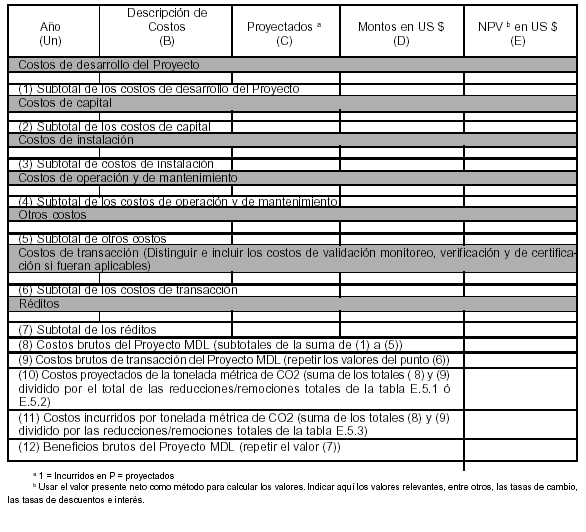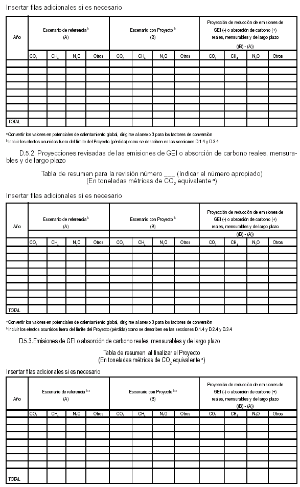 a Convertir los valores en potenciales de calentamiento global, dirigirse al anexo 3 para los factores de conversiónb Incluir los efectos ocurridos fuera del límite del Proyecto (pérdida) como se describen en las secciones E.1.4, E. 2.4, E.3.4 y E. 4.c Valores que difieren de aquéllos que figuran en la tabla E.5.1, deben marcarse en negrita.D.6 Adicionalidad ambiental Explicación del modo en que la actividad de Proyecto cumple con los requisitos de adicionalidad D.6.1 Los proponentes del Proyecto tendrán que demostrar de manera objetiva a la Oficina que las medidas efectuadas y a efectuarse exceden o sobrepasan lo que probablemente hubiera sucedido o sucedería en la ausencia del Proyecto. D.6.2 La reducción de emisiones de gases de efecto invernadero o la absorción de carbono atmosférico deberá ser superior a lo establecido en el escenario de referencia. Esto requiere una comparación entre lo que se hubiese reducido o removido con el Proyecto y sin el mismo. D.7 Procedimientos de valoración Llenar las subdivisiones aplicables a la actividad de Proyecto MDL D.7.1 Cronograma de Acción Previsto