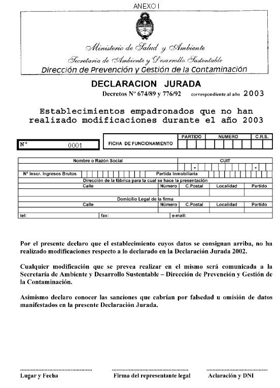 Art. 3º — Aprobar el formulario a presentar por los establecimientos industriales y/o especiales que no hayan sufrido modificaciones respecto a lo declarado en la Declaración Jurada año 2002 y que como Anexo I forma parte integrante de la presente.