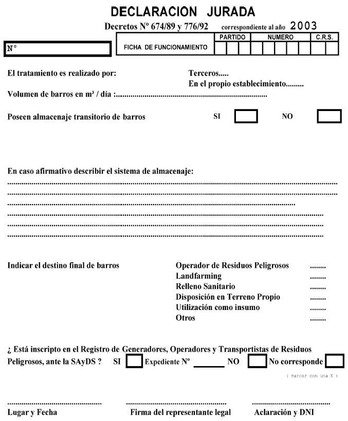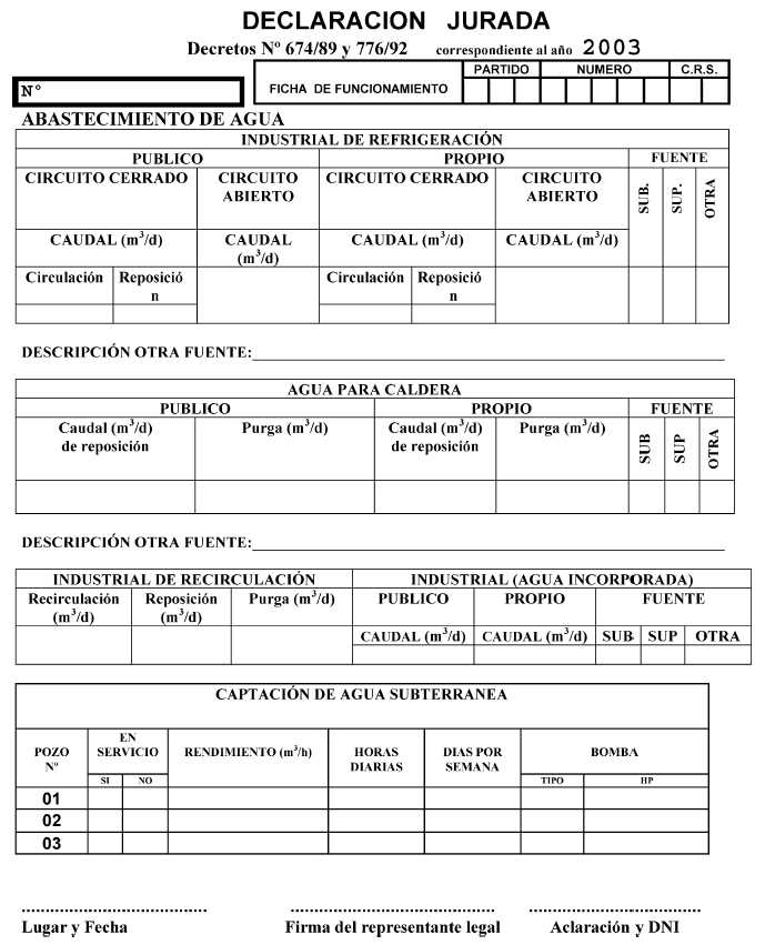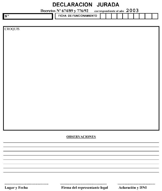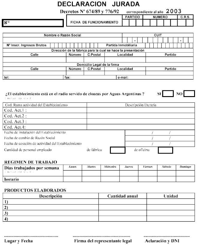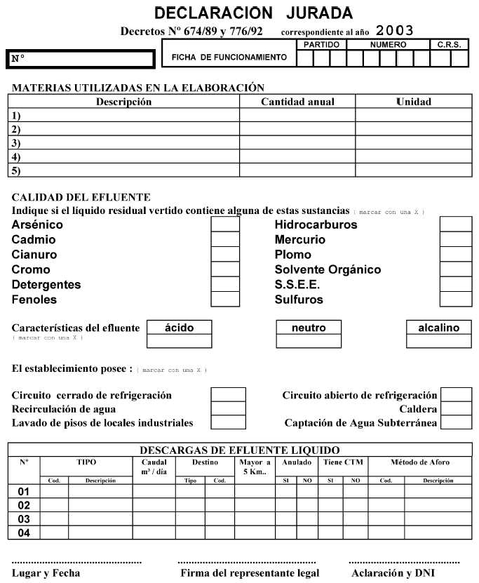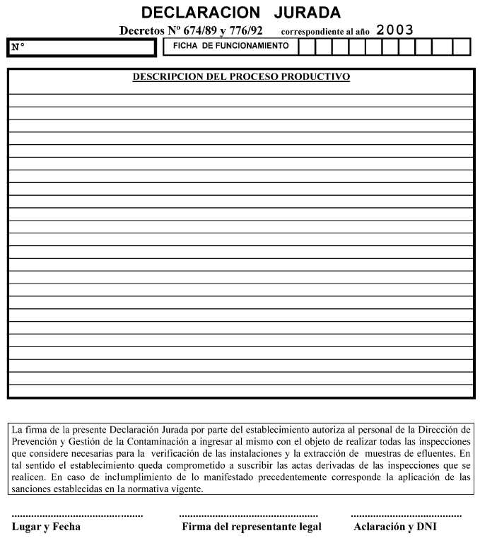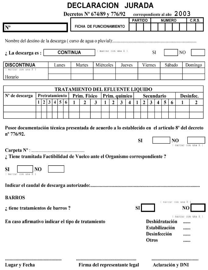 Establecimientos industriales y/o especiales comprendidos en el artículo 10º del Decreto Nº 674/89, modificado por su similar Nº 776/92. Fíjase el plazo para la presentación de la Declaración Jurada correspondiente al año 2003. declaración jurada 2003 - Anexo 01 declaración jurada 2003 - Anexo 02