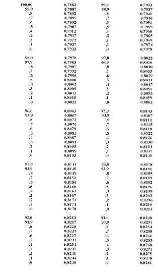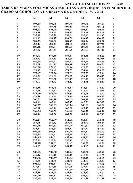 3º — Adóptanse las respectivas tablas, de masas volúmicas a 20°C, en función del grado alcohólico a la décima de grado, que están publicadas en la "GUIDE PRACTIQUE D’ALCOOMETRIE" con la autorización de la Organización Internacional de Metrología Legal y que figuran como anexos I y II de la presente Resolución.