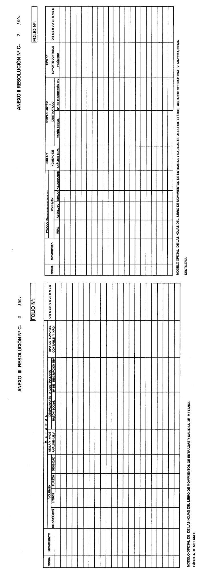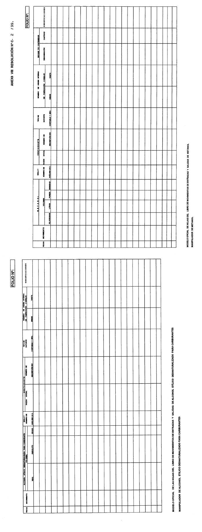 INSTRUCTIVO PARA EFECTUAR LOS ASIENTOS EN EL LIBRO OFICIAL DE MOVIMIENTOS DE ENTRADAS Y SALIDAS DE ALCOHOL ETILICO, AGUARDIENTE NATURAL Y DE CORRESPONDER, MATERIA PRIMA DE ORIGEN VINICO. —DESTILERIA DE ALCOHOL ETILICO— —DESTILERIA DE ALCOHOL ETILICO ORIGEN VINICO— En este libro habilitado por el I.N.V., se asentarán en forma manuscrita, en la fecha en que ellos se hayan realizado y de acuerdo al número de análisis, los movimientos del volumen de alcohol; buen gusto, mal gusto, anhidro, desnaturalizado; flegma; aceite fusel; aguardiente natural, etc. y de corresponder, la materia prima de origen vínico (orujo; borras; sólidas y semifluida; y vino), disponibles, intervenidos, inmovilizados o decomisados, propiedad del responsable o de otras personas físicas y/o jurídicas, según el siguiente detalle: a) diariamente los relacionados a las entradas y salidas del establecimiento (traslados, importaciones, exportaciones, reingresos, etc.) y b) en un solo asiento por movimiento, diariamente y a opción del inscripto semanalmente, aquellos efectuados internamente (destilación, rectificación, desnaturalización, mermas por destilación, etc.). FORMA DE LLENADO: 1. — FOLIO NUMERO: Deberá contener la numeración de los folios u hojas preimpresa. 2. — FECHA: Se indicará día, mes y año, en que se produce el movimiento. 3. — MOVIMIENTO: Según la Tabla de Códigos de Movimientos, registrar la denominación únicamente. Ejemplo: Ingreso por traslado. 4. — PRODUCTO: Conforme al tipo de producto indicado en la Tabla de Códigos de Productos, se deberán abrir tantas columnas como tipo de alcohol y de corresponder, materia prima de origen vínico existan en la destilería, asentando la denominación únicamente. Se dejarán habilitadas columnas en blanco, para posibles intervenciones o decomisos a efectuar por parte del I.N.V., en esos casos, a continuación del tipo de producto, se indicará el estado del mismo (Ej. alcohol etílico buen gusto de origen vínico intervenido). 5. — VOLUMEN: Deberán registrarse en el LIBRO OFICIAL DE DESTILERIA, los volúmenes reales y absolutos, expresados a 20°C (en función del grado alcohólico internacional), tanto para el alcohol y aguardiente natural, como para la materia prima contabilizable (vino y borra semifluida), debiendo señalar además, su grado alcohólico, también expresado a 20°C (grado alcohólico internacional) y en % v/v. El volumen de la materia prima no contabilizable (borra seca y orujo), deberá expresarse en kilogramos. En los ALCOHOLES BUEN GUSTO, MAL GUSTO, ANHIDRO, DESNATURALIZADO; FLEGMA; ACEITE FUSEL; AGUARDIENTE NATURAL, ETC., para determinar el grado alcohólico real, fuerza real o grado alcohólico en volumen real y el volumen absoluto, cuyos valores de observación se encuentran comprendidos entre –10°C y +40°C de temperatura (t) y entre 0,0 y 103,1% v/v de grado alcohólico (q*), se utilizarán las tablas VIIIb y XIbb, implementadas por Resolución Nº C-62/98. En todos los casos los volúmenes consignados en el libro oficial, deberán ir precedidos del signo de suma o de resta, según el tipo de movimiento (+ en los ingresos; – en los egresos). 6. — SIGLA Y NUMERO DE ANALISIS I.N.V.: Atento al tipo de producto, indicar la sigla y el número de análisis de Libre Circulación, Exportación, Importación o de Control en el caso de intervenciones, otorgado por el I.N.V. (Ej. M700.000). 7. — RAZON SOCIAL: Deberá asentarse la razón social del despachante o remitente del cual proviene el producto ingresado, o del destinatario o receptor, al cual va el producto egresado, conforme al certificado de inscripción otorgado por el I.N.V. En el caso de exportaciones o importaciones, se indicará la razón social atento la documentación comercial o aduanera que avale tal circunstancia. 8. — NUMERO DE INSCRIPCION I.N.V.: Se deberá asentar el número de inscripción del establecimiento despachante del cual proviene el producto ingresado, o del destinatario o receptor al cual va el producto egresado, atento al certificado de inscripción otorgado por el I.N.V. En el caso de exportaciones o importaciones, no se indicará tal concepto, en su lugar se asentará el nombre del país de destino o de origen del producto. 9. — TIPO DE SOPORTE CONTABLE Y NUMERO: En esta columna se asentará el tipo y número del soporte contable, factura, remito, guía, MVO2 (solicitud de traslado), etc., que amparó el desplazamiento del producto desde/hasta destino (ingreso o egreso). Para el caso de factura se indicará la letra "F", para el remito se utilizará la letra "R", para una guía interna la letra "G", para una solicitud de traslado- MVO2, la letra "M", etc., y en todos los casos, seguido por el número correspondiente a que se hace referencia. "Es por ello que será condición indispensable para el ingreso a destilería, que la materia prima no contabilizable, borra sólida y orujo, esté amparada por documentación comercial, remito, guía, factura, etc.". Esta documentación comercial o soporte contable, "será confeccionada por la bodega, fábrica de mostos o destilería y acompañará al producto en su tránsito, traslado o circulación desde aquellos establecimientos, hasta su ingreso a la destilería receptora", deberá contener, además de los obligatorios, los siguientes datos: a) Producto; b) Volumen; c) Destinatario; (Razón Social y Nº de inscripción I.N.V.) y d) Nº de dominio del contenedor (camión, acoplado, semirremolque, etc.). 10. — OBSERVACIONES: Columna destinada para asentar cualquier dato de interés. INSTRUCTIVO PARA EFECTUAR LOS ASIENTOS EN EL LIBRO OFICIAL DE MOVIMIENTOS DE ENTRADAS Y SALIDAS DE METANOL. —FABRICA DE METANOL— En este libro habilitado por el I.N.V., deberán asentarse en forma manuscrita los movimientos de metanol disponible, intervenido, inmovilizado o decomisado, propiedad del responsable o de otras personas físicas y/o jurídicas, conforme al siguiente detalle: 
