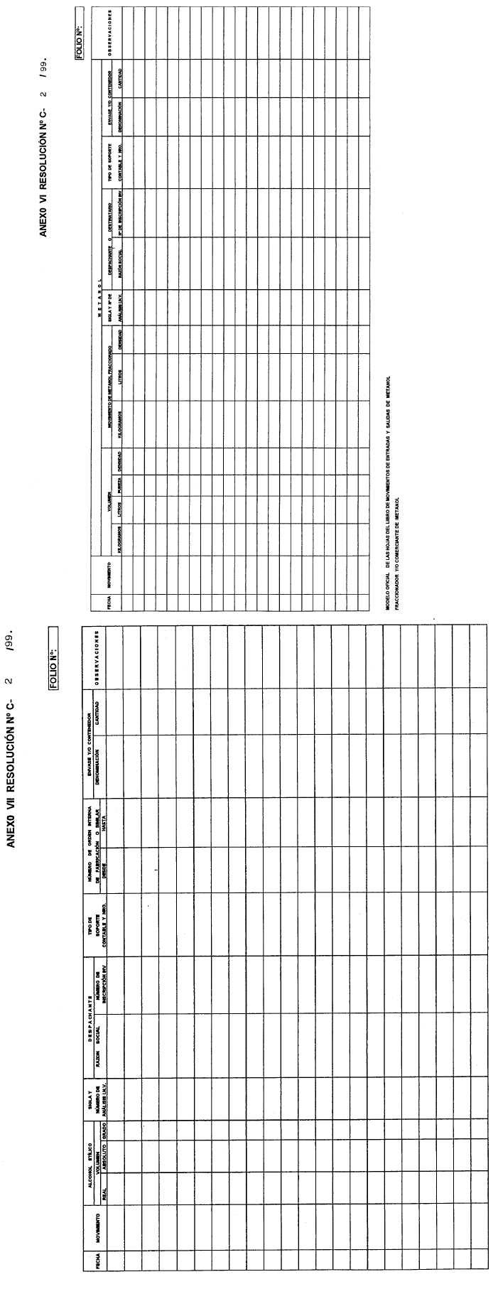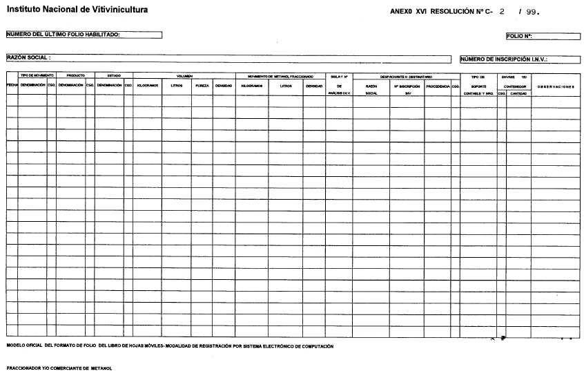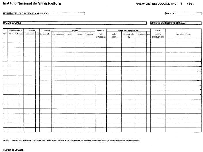 INSTRUCTIVO DE LOS ANEXOS XIII, XIV, XV, XVI, XVII, XVIII, XIX Y XX, PARA EFECTUAR LOS ASIENTOS EN EL LIBRO OFICIAL DE HOJAS MOVILES - MODALIDAD DE REGISTRACION POR SISTEMA ELECTRONICO DE COMPUTACION: La obligación de los responsables inscriptos de llevar Libros Oficiales en forma manuscrita y de presentar una Declaración Jurada Mensual, podrá cumplimentarse, en una sola entrega, en forma conjunta y a opción de aquéllos, con la presentación ante la Dependencia Jurisdiccional del Instituto Nacional de Vitivinicultura, de un listado mensual emitido por sistema electrónico de computación, habilitando ejemplares de hojas móviles correlativamente numeradas. En este Libro Oficial de Hojas Móviles habilitado por el I.N.V., deberán asentarse los movimientos de los productos según corresponda al establecimientos inscripto, sean disponibles, intervenidos, inmovilizados o decomisado, propiedad del responsable o de otras personas físicas y/o jurídicas, conforme a las pautas de llenado discriminadas en los Anexos precedentes para cada inscripto: Destilería, Fábrica de Metanol, Fraccionador y/o Comerciante de Alcohol Etílico (puro y desnaturalizado) y Metanol y Manipulador de Etanol y Metanol. 1. — CARATULA, CANTIDAD DE FOLIOS Y FORMATO FINAL DE LAS HOJAS, ENCUADERNACION, CANTIDAD DE EJEMPLARES, LUGAR Y FECHA DE PRESENTACION: 1.1. — CARATULA: La primer hoja del Libro Oficial de Hojas móviles, que no se numerará, deberá contener la siguiente leyenda: El INSTITUTO NACIONAL DE VITIVINICULTURA habilita esta hoja que será la cabeza del libro Nro. … (…) de hojas móviles llevado por sistema electrónico de computación y correspondiente al Movimiento de Entradas y Salidas de (1) ……, perteneciente a la firma… inscripta ante el I.N.V. como (2)… con el Nro.…, ubicada en la Localidad de …, Departamento o Partido de …, Provincia de … Lugar y fecha… (1) Indicar el tipo de producto que se trate, alcohol etílico (puro y desnaturalizado), aguardiente natural, materia prima y metanol, según corresponda. (2) Indicar el tipo de establecimiento (destilería, fábrica de metanol, fraccionador y/o comerciante de alcohol etílico puro, desnaturalizado y metanol y manipuladores de etílico y metanol, según corresponda). FIRMA Y SELLO DEL RESPONSABLE DEL I.N.V. 1.2. — CANTIDAD DE FOLIOS Y FORMATO FINAL DE LAS HOJAS: Por razones de operatividad, el Libro Oficial de Hojas Móviles de cada uno de los establecimientos indicados, deberá contener como MAXIMO APROXIMADAMENTE CIEN (100) hojas, impresas en anverso únicamente, siguiendo el modelo oficial de diseño, las que se encuadernarán con posterioridad. Completadas las CIEN (100) hojas móviles, o la última que se habilite en el supuesto que el listado mensual supere el número de folios indicado, el Inscripto deberá presentar una nueva carátula (punto 1.1. precedente) y comenzar otro libro de hojas móviles, con los mismos fines y destinos. El formato final del libro Oficial de Hojas Móviles, cualquiera sea su orientación, deberá contener como "MAXIMO" TRESCIENTOS CINCUENTA Y CINCO MILIMETROS (355 mm) de ancho, por TRESCIENTOS CINCO MILIMETROS (305 mm) de alto; y como "MINIMO" DOSCIENTOS DIEZ MILIMETROS (210 mm) de ancho, por DOSCIENTOS NOVENTA Y SIETE MILIMETROS (297 mm) de alto. 1.3. — CANTIDAD DE EJEMPLARES, LUGAR Y FECHA DE PRESENTACION DE LOS LISTADOS: El listado nombrado, que tendrá carácter de Declaración Jurada, reemplazará "AL LIBRO OFICIAL DE MOVIMIENTOS DE ENTRADAS Y SALIDAS DE PRODUCTOS", aprobado por la presente y "A LA DECLARACION JURADA MENSUAL", instrumentada por la Resolución Nº C-011/96. Deberá presentarse mensualmente por duplicado, en la Dependencia del I.N.V. Jurisdiccional al inscripto, en el plazo establecido para las Declaraciones Juradas, de hasta OCHO (8) días corridos posteriores al mes que se declara. 1.4. — HABILITACION Y DESTINO DE LOS EJEMPLARES DEL LIBRO DE HOJAS MOVILES: Recibidas las hojas móviles, el I.N.V. habilitará cada folio con sello foliador de la Dependencia e inicial del responsable de la misma, y les dará a los ejemplares el siguiente destino: ORIGINAL: Será devuelto al inscripto perfectamente conformado, pasando a formar parte de un libro oficial de hojas móviles correlativamente numeradas. DUPLICADO: Para la Dependencia jurisdiccional del I.N.V. Esta copia servirá de Declaración Jurada Mensual, la que será archivada una vez procesada en el sistema informático de la Dependencia. 2. — FORMA DE LLENADO: 2.1. — NUMERO DEL ULTIMO FOLIO HABILITADO: La primer hoja del listado mensual que se presente, deberá contener en el costado superior izquierdo, el número del último folio habilitado, éste deberá ser concordante con el último folio declarado y servirá para que la Dependencia receptora, efectúe el primer control. 2.2. — FOLIO NUMERO: Deberá tener de acuerdo a lo especificado precedentemente, la numeración de los folios que les corresponda mensualmente, preimpresa, comenzando el libro con la hoja Nro. UNO (1) y finalizando aproximadamente con la CIEN (100). 2.3. — RAZON SOCIAL: Por revestir carácter de Declaración Jurada, en cada hoja móvil deberá asentarse la razón social del establecimiento, atento al certificado de inscripción otorgado por I.N.V. 2.4. — NUMERO DE INSCRIPCION I.N.V.: Por igual concepto, en cada una de las hojas móviles, se deberá registrar el número de inscripción del establecimiento, conforme al certificado de inscripción otorgado por el I.N.V. 2.5. — FECHA: Se deberá indicar día, mes y año, en que se produce el movimiento, según el producto que se trate. 2.6. — TIPO DE MOVIMIENTO: De acuerdo al producto, señalar la denominación y el código del movimiento según la Tabla de Códigos de Movimientos. Ejemplo: Ingreso por Traslado, código 237, siguiendo las pautas establecidas en los anexos precedentes para cada establecimiento inscripto en particular (asientos diarios y semanales). 2.7. — PRODUCT