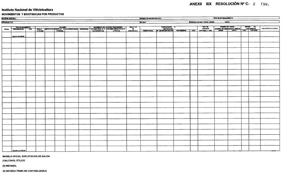 Bs. As., 12/2/99 VISTO el Expediente Nº 189-000262/97-3 del registro de este Organismo, la Ley Nacional de Alcoholes Nº 24.566, las Resoluciones Nros. C-002/95, C-011/96, C-003/97, C-37/97, C-57/98, C- 58/98, C-62/98, C-63/98 y C-65/98, y CONSIDERANDO: Que el Artículo 4º de la mencionada Ley establece que el Instituto Nacional de Vitivinicultura será la autoridad de aplicación y dictará las normas reglamentarias necesarias para la prosecución de los fines inherentes a la misma. Que el Título I, Capítulo VII, de la Resolución Nº C-011/96, establece la obligatoriedad de los inscriptos de llevar Libros Oficiales habilitados por el Instituto Nacional de Vitivinicultura. Que es necesario contar con elementos indispensables destinados a volcar los movimientos de entradas y salidas producidos en la manipulación de alcohol etílico, aguardiente natural, metanol y de corresponder, materia prima contabilizable. Que la registración de los citados movimientos, puede efectuarse por sistemas electrónicos de computación, utilizando la misma información que la de los Libros Oficiales que sustituye, habilitando ejemplares de hojas móviles correlativamente numeradas por los inscriptos. Por ello, y en uso de las facultades conferidas por las Leyes Nros. 14.878 y 24.566, el Decreto- Ley Nº 2284/91 y los Decretos Nros. 1084/96 y 1286/98, EL DIRECTOR NACIONAL DEL INSTITUTO NACIONAL DE VITIVINICULTURA RESUELVE: Artículo 1º — Apruébanse los Modelos Oficiales de Hojas de Libros de Movimientos de Entradas y Salidas de Alcohol y Materia Prima Origen Vínico para: destilería, fábrica, fraccionador y/o comerciante y manipulador y las normas a las que deberán atenerse los responsables inscriptos para efectuar las registraciones en los mismos, que como Anexos I al IX, forman parte de la presente Resolución. Art. 2º — Apruébanse las Tablas de Códigos de productos; de Movimientos de Productos y de Capacidad Según Tipo de Envases de Fraccionamiento y Códigos de Capacidad de Contenedores Tanques a Granel (camiones, acoplados, semirremolques y vagones tanque), que como Anexos X al XII, forman parte de la presente Resolución. Art. 3º — Cuando personal de fiscalización del Organismo practique inventario general, y el mismo se encuentre dentro de la tolerancia reglamentaria establecida, el inscripto deberá proceder a ajustar los saldos del Libro Oficial de Movimientos, a la existencia real constatada, ingresando o egresando en forma proporcional a cada producto, las diferencias de volúmenes según corresponda. Art. 4º — Si de la existencia real constatada se encontraran diferencias en más fuera de la tolerancia del MEDIO POR CIENTO (0,5%), el inscripto procederá a ingresar el volumen de excedente intervenido, a una columna habilitada para tal fin en el libro Oficial de Movimientos de Entradas y Salidas, como "PRODUCTO INTERVENIDO POR EXCEDENTE DE INVENTARIO". Asimismo, adecuará los saldos del libro a la existencia real comprobada incluida la tolerancia en más permitida. Art. 5º — Si el inventario se encuentra fuera de la tolerancia reglamentaria en menos, el responsable, deberá proceder a ajustar los saldos del Libro Oficial de Movimientos, a la existencia real constatada, egresando en forma proporcional a cada producto, las diferencias de volúmenes en menos, según corresponda. Art. 6º — La obligación de los responsables inscriptos de llevar en forma manuscrita Libro Oficial de Movimientos, como asimismo proporcionar al INSTITUTO NACIONAL DE VITIVINICULTURA una Declaración Jurada Mensual de los mismos, podrá cumplimentarse con la sola presentación de un listado mensual emitido por sistema electrónico de computación, habilitando ejemplares de hojas móviles correlativamente numeradas, pasando a formar parte del Libro Oficial de Hojas Móviles-Modalidad de Registración por Sistema Electrónico de Computación. Apruébanse las normas para ejecutar los mismos y que integran la presente Resolución como Anexos XIII al XX. Art. 7º — Los listados detallados en el punto precedente, y una vez consensuada la adaptación entre los sistemas electrónicos de computación del Instituto Nacional de Vitivinicultura y los de las empresas, deberán ir acompañados por un soporte magnético (disco flexible o disquete), cuyo diseño y normas para su desarrollo, serán oportunamente indicados. Art. 8º — Los inscriptos según corresponda a su tipo de establecimiento, que opten por el Libro Oficial de Hojas Móviles-Modalidad de Registración por Sistema Electrónico de Computación instrumentado precedentemente, quedan eximidos de llevar en forma manuscrita el Libro Oficial de Movimientos de Entradas y Salidas de Alcohol y Materia Prima Origen Vínico citado en punto 1º, y de presentar la Declaración Jurada Mensual descripta en la Resolución Nº C-011/96, según el establecimiento que se trate, atento que dicha hoja móvil cumplirá funciones de tal. Art. 9º — Otórgase un plazo máximo de TREINTA (30) días corridos a partir de la publicación de la presente Resolución, para que los responsables inscriptos, implementen las normas establecidas en puntos anteriores. Art. 10. — Cualquier declaración inexacta acto de omisión, serán considerados en infracción al Artículo 29, inc. f) de la Ley Nº 24.566 y los responsables se harán pasibles de las sanciones establecidas por el Artículo 30 de la citada Ley. Art. 11. — Derógase del Anexo a la Resolución Nº C-003/97, el Punto 1.2. in fine y el segundo párrafo del Punto 1.3.b. Art. 12. — Regístrese, comuníquese, publíquese, dése a la Dirección Nacional del Registro Oficial para su publicación, notifíquese y cumplido, archívese. — Félix R. Aguinaga. ANEXO I RESOLUCION Nº C. 2/99 NORMAS GENERALES PARA EL LLENADO DEL LIBRO OFICIAL DE MOVIMIENTOS DE ENTRADAS Y SALIDAS DE VOLUMENES DE ALCOHOL ETILICO, AGUARDIENTE NATURAL, MATERIA PRIMA DE ORIGEN VINICO Y METANOL, SEGUN EL ESTABLECIMIENTO QUE SE TRATE: ENCU