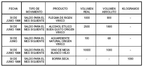 Cumplimentado el paso anterior, se procederá a registrar los movimientos del mes. 3.1.2. — PARA EL MES SIGUIENTE POR PRODUCTO: Al final de cada mes y antes de estampar la leyenda tipo (punto 4 siguiente), se deberá indicar en columna producto y por tipo de producto el "SALDO PARA EL MES SIGUIENTE", registrando en cada una de las columnas correspondientes a los productos, los siguientes guarismos: volumen real y absoluto para el alcohol etílico puro y desnaturalizado, aguardiente natural, flegma, etc.; kilogramos y litros para el metanol, y kilogramos para la materia prima no contabilizable. Ejemplo: