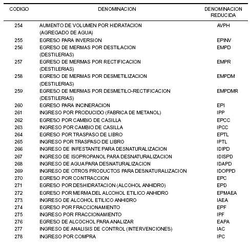 INSTRUCTIVO DEL ANEXO XI PARA EL USO DE LA TABLA DE MOVIMIENTOS DE PRODUCTOS, SEGUN DENOMINACION DEL MOVIMIENTO 110 - INGRESO DE ANALISIS LIBRE CIRCULACION: Para declarar en el Libro Oficial, los movimientos de ingreso del volumen de alcohol etílico, aguardiente natural y materia prima contabilizable, analizados por libre circulación. La fecha de este movimiento a registrar, deberá ser y coincidir con la del sello fechador estampado en el certificado analítico habilitado por el Instituto Nacional de Vitivinicultura. 112 - EGRESO POR EXPORTACION: Para indicar las salidas producidas por exportación, que deben ser concordantes con los volúmenes consignados en la comunicación diaria correspondiente. 113 - EGRESO POR MERMAS: Para descargar las mermas resultantes del estudio de inventario practicado por el Organismo. 116 - INGRESO POR IMPORTACION: Para indicar las entradas producidas por importación. 117 - EGRESO POR DERRAME: Se utilizará para indicar únicamente los derrames accidentales y los autorizados referidos a los productos "no alcohólicos" existentes dentro de los establecimientos industrializadores de alcoholes. 129 - ENTRADA POR REINGRESO: Para denunciar los ingresos de productos despachados, ya sea a granel o fraccionados y con cargo a una determinada documentación oficial (remito, factura, guía, trámite, sumario, expediente, etc.). 203 - ANULACION: Para declarar en el Libro Oficial, los movimientos mal asentados. En el caso de que los libros se lleven por sistemas electrónicos de computación, si la cifra se ha registrado de más, se indicará con un signo negativo para deducirlo; si se ha consignado en menos, se indicará con un signo positivo para sumarla, los signos que correspondan se indicarán precediendo la correspondiente cifra volumétrica. 231 — INGRESO DE ANALISIS APTITUD EXPORTACION: Para declarar en el Libro Oficial, los movimientos de ingreso del volumen de alcohol etílico, aguardiente natural y metanol, según corresponda, analizados por aptitud de exportación. La fecha de este movimiento a registrar, deberá ser y coincidir con la del sello fechador estampado en el certificado analítico habilitado por el Instituto Nacional de Vitivinicultura. 235 — INGRESO DE ANALISIS APTITUD IMPORTACION: Para declarar en el Libro Oficial, los movimientos de ingreso del volumen de alcohol etílico, aguardiente natural y metanol, según corresponda, analizados por aptitud importación. La fecha de este movimiento a registrar, deberá ser y coincidir con la del sello fechador estampado en el certificado analítico habilitado por el Instituto Nacional de Vitivinicultura. 236 — INGRESO DE ANALISIS LIBRE CIRCULACION TIPO (METANOL): Para declarar en el Libro Oficial, los movimientos de ingreso del volumen de metanol analizados por libre circulación tipo. La fecha de este movimiento a registrar, deberá ser y coincidir con la del sello fechador estampado en el certificado analítico habilitado por el Instituto Nacional de Vitivinicultura. 237 — INGRESO POR TRASLADO: Para indicar los ingresos a granel (contenedores tanque) de alcoholes provenientes de otros inscriptos ante el I.N.V. Como asimismo para asentar las materias primas y los desnaturalizantes ingresados. 238 — EGRESO POR TRASLADO: Para indicar los egresos a granel (contenedores tanque) de alcoholes, como asimismo para asentar las materias primas egresadas a otros inscriptos ante el I.N.V., como por ejemplo otra destilería, y cuyos volúmenes deben ser concordantes con los consignados en la comunicación diaria correspondiente. 239 — INGRESO POR DIFERENCIA DE INVENTARIO: Para denunciar movimiento producidos por diferencias en inventarios practicados por personal del I.N.V. y por indicación de éstos en forma actuada. 240 — EGRESO POR DIFERENCIA DE INVENTARIO: Para denunciar movimientos producidos por diferencias en inventarios practicados por personal del I.N.V. y por indicación de éstos en forma actuada. 241 — EGRESO PARA DESTILACION (DESTILERIAS): Para indicar la salida de materia prima para su destilación. 242 — INGRESO POR ESTILACION (DESTILERIAS): Para indicar los ingresos de alcoholes producidos por el proceso de destilación. 243 — INGRESO POR RECTIFICACION (DESTILERIAS): Para indicar el ingreso de flegmas u otros alcoholes rectificados. 244 — EGRESO PARA RECTIFICACION: Para indicar los egresos de productos con destino a tal operación. 245 — INGRESO PARA DESNATURALIZACION: Para indicar el agregado del "infestante" y sustancias testigos en la desnaturalización de alcoholes para uso doméstico, carburantes, otros. 246 — EGRESO PARA DESNATURALIZACION: Para indicar la salida del acohol para la obtención de alcoholes desnaturalizados de diferentes tipos. 247 — EGRESO POR INTERVENCION: Para indicar las salidas de productos por intervenciones oficiales de productos. 248 — INGRESO POR INTERVENCION: Para indicar los ingresos de productos intervenidos al habilitar la columna correspondiente por intervenciones oficiales de productos. 249 — INGRESO POR DESINTERVENCION: Para indicar los ingresos de productos desintervenidos por el Instituto Nacional de Vitivinicultura. 250 — EGRESO POR DESINTERVENCION: Para indicar los egresos de productos por desintervenciones oficiales producidas. 251 — EGRESO PARA CORTE: Para denunciar movimientos producidos en los libros respecto a cortes con otros alcoholes. 252 — INGRESO PARA CORTE: Para denunciar movimientos producidos en los libros respecto a cortes con otros alcoholes. 253 — EGRESO DEL ESTABLECIMIENTO DE ALCOHOL FRACCIONADO (CON SOPORTE CONTABLE): Para denunciar las salidas de planta de los productos fraccionados, egresos que deben estar amparados por soportes contables (remito, guía, factura). 254 — AUMENTO DE VOLUMEN POR INHABILITACION (AGREGADO DE AGUA): Para denunciar los ingresos de hidratante (agua) para disminuir el contenido alcohólico. 255 — EGRESO PARA INVERSION: Para indicar la mezcla de alcohol etílico y/o meta