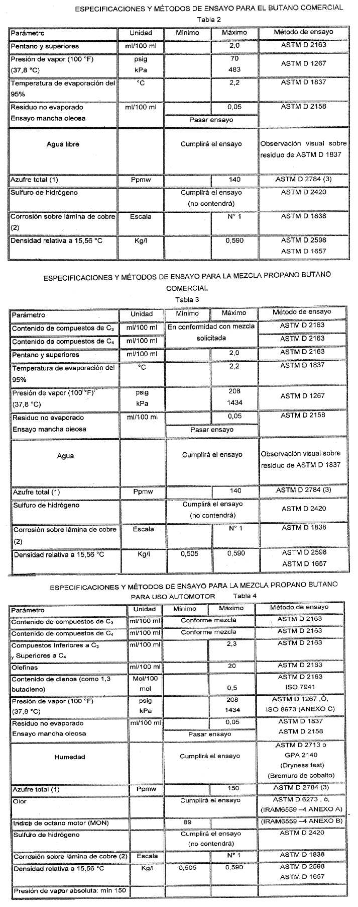 Bs. As., 13/1/2006 VISTO el Expediente Nº S01:0355634/2005 el Registro del MINISTERIO DE PLANIFICACION FEDERAL, INVERSION PUBLICA Y SERVICIOS, lo dispuesto por la Ley Nº 26.020, y CONSIDERANDO: Que la Ley Nº 26.020 estableció el "REGIMEN REGULATORIO DE LA INDUSTRIA Y COMERCIALIZACION DE GAS LICUADO DE PETROLEO". Que por medio de ella se regulan todas las actividades de producción, transporte, almacenamiento, fraccionamiento, comercialización, distribución, servicios de puerto, así como las referidas a calidad, cantidad y precio. Que resulta de interés general garantizar que el producto Gas Licuado de Petróleo (GLP) sea comercializado respetando estándares de calidad admitidos internacionalmente. Que de acuerdo a lo dispuesto por el inciso n) y q) del Artículo 37 de la Ley Nº 26.020, corresponde determinar, la calidad y el procedimiento a seguir para realizar el control sistemático de calidad del Gas Licuado de Petróleo (GLP). Que el control de calidad del Gas Licuado de Petróleo (GLP), constituye una herramienta fundamental para garantizar a los consumidores del mismo, las debidas condiciones de calidad y seguridad que las características particulares del producto requieren, y a su vez constituye una herramienta esencial para lograr un mercado competitivo. Que a tal fin se torna necesario establecer las características específicas que el producto requiere, acompañado de un programa de control de los parámetros de calidad y métodos de ensayo, en las distintas etapas de comercialización para el Gas Licuado de Petróleo (GLP) —butano, propano y mezcla de ambos— para su uso comercial. Que por ello y a los fines de dar acabado cumplimiento con lo dispuesto por la Ley Nº 26.020 y su decreto reglamentario, resulta imperioso establecer un procedimiento eficaz de control de la calidad del producto, juntamente con un sistema de sanciones para el caso de incumplimiento, apuntando así al mejoramiento de la provisión de Gas Licuado de Petróleo (GLP) a granel y/o envasado en garrafas y cilindros para sus diferentes usos y en términos de calidad, seguridad y competencia sectorial, permitiendo otorgar plena operatividad a la normativa vigente. Que la DIRECCION GENERAL DE ASUNTOS JURIDICOS del MINISTERIO DE ECONOMIA Y PRODUCCION ha tomado la intervención que le compete conforme lo establecido en el Artículo 9º del Decreto Nº 1142 de fecha 26 de noviembre de 2003. Que la presente medida se dicta en uso de las facultades emergentes del Artículo 37º de la Ley Nº 26.020. Por ello, EL SECRETARIO DE ENERGIA RESUELVE: Artículo 1º — Créase en el ámbito de la SUBSECRETARIA DE COMBUSTIBLES, dependiente de la SECRETARIA DE ENERGIA, el "PROGRAMA NACIONAL DE CONTROL DE CALIDAD DEL GAS LICUADO DE PETROLEO" (GLP). Art. 2º — El programa creado por el artículo 1º) tendrá los siguientes objetivos: a) Asegurar que la calidad del Gas Licuado de Petróleo (GLP) nacional, se encuentre dentro de los parámetros establecidos internacionalmente. b) Promover en el sector la creación de un mercado donde se comercialice el producto en condiciones de seguridad y competencia. c) Proteger adecuadamente los derechos de los consumidores. d) Propender que el precio del producto sea el resultado de un servicio que se presta en las condiciones de calidad y seguridad exigidas. e) Asegurar que se cumpla con la finalidad de la regulación, que se completa con un mecanismo de control eficiente. Art. 3º — Son de aplicación obligatoria el cumplimiento de las ESPECIFICACIONES Y METODOS DE ENSAYO establecidos en el ANEXO I —que forma parte de la presente resolución— y que se corresponde: 3.1. Tabla 1 para el PROPANO COMERCIAL; 3.2 Tabla 2 para el BUTANO COMERCIAL; 3.3 Tabla 3 para la MEZCLA PROPANO BUTANO COMERCIAL; y 3.4 Tabla 4 para la MEZCLA PROPANO BUTANO PARA USO AUTOMOTOR. Art. 4º — Es de cumplimiento obligatorio el ODORIZADO del producto Gas Licuado de Petróleo (GLP) a partir de su producción, cuando sea destinado al mercado de envases descartables, microgarrafas, garrafas, cilindros y venta a granel de acuerdo a la "NORMA DE ODORIZACION DEL GAS", que como ANEXO II forma parte de la presente resolución. Se exceptúa de la obligatoriedad mencionada en el acápite anterior, cuando el producto Gas Licuado de Petróleo (GLP) sea destinado a propelente para aerosoles u otros usos industriales que utilicen dicho producto con características inodoras. Art. 5º — Se encuentran sujetos a inspección, control y fiscalización del "PROGRAMA NACIONAL DE CONTROL DE CALIDAD DEL GAS LICUADO DE PETROLEO" (GLP) todos los sujetos activos de la industria, que comercialicen el producto mencionado en el artículo 3º) de la presente resolución, incluyendo a las Empresas Petroquímicas y Procesadoras que obtengan el producto (GLP) como primario y/o secundario y/o residual. Art. 6º — Las firmas Productoras, Petroquímicas y Procesadoras deben contar con: a) Laboratorio para realizar ensayos de Gas Licuado de Petróleo (GLP) propio o contratado. b) Equipamiento con capacidad para realizar ensayos físico-químicos del producto. c) Sistemas manuales o automáticos para tomar muestras puntuales o en forma proporcional a la producción en las plantas de proceso, almacenamiento, bocas de carga, etc., según lo establecido por la Norma IRAM IAP 66 – 20. d) Sistema de Aseguramiento de Calidad para los laboratorios y equipamientos normalizados a emplear en las tareas de control de calidad de Gas Licuado de Petróleo (GLP), los que deberán estar certificados por norma IRAM —ISO 9001— "Sistemas de Gestión de Calidad". e) Puntos de verificación de calidad para toma de muestra o ensayo en plantas de proceso, almacenamiento o bocas de carga. Art. 7º — Aquellos operadores que a la entrada en vigencia de la presente resolución no cuenten con el Sistema de Aseguramiento de Calidad de los laboratorios y equipamientos a emplear en las tareas de control de calidad del Gas Licuado de Petróleo (GL