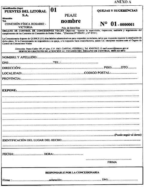 e) Reclamos y sugerencias: Los Usuarios tienen derecho a expresar sus sugerencias y/o deducir las quejas o reclamos por irregularidades en la prestación de servicios. Los mismos serán interpuestos ante la Concesionaria, en las estaciones de peaje o en la sede central de la concesionaria o a través de la línea telefónica gratuita. Las quejas o reclamos, para ser considerados como tales, deberán ser interpuestos, en la forma y los plazos fijados por el presente reglamento.