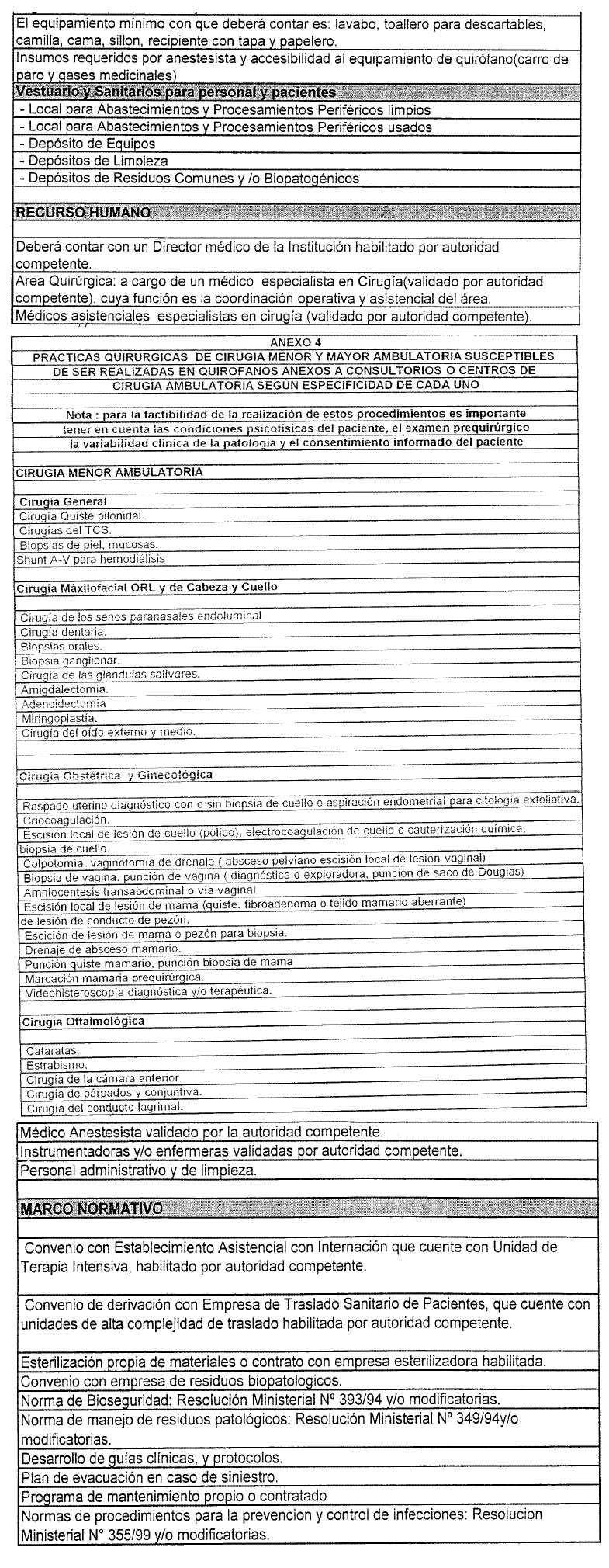 Art. 4° — Establécese que los quirófanos anexos a consultorios deberán cumplimentar los requerimientos definidos en el ANEXO I y sólo podrán realizar Cirugía Menor Ambulatoria. Entendiéndose por Cirugía Menor Ambulatoria a la descripta en el Artículo 2°.