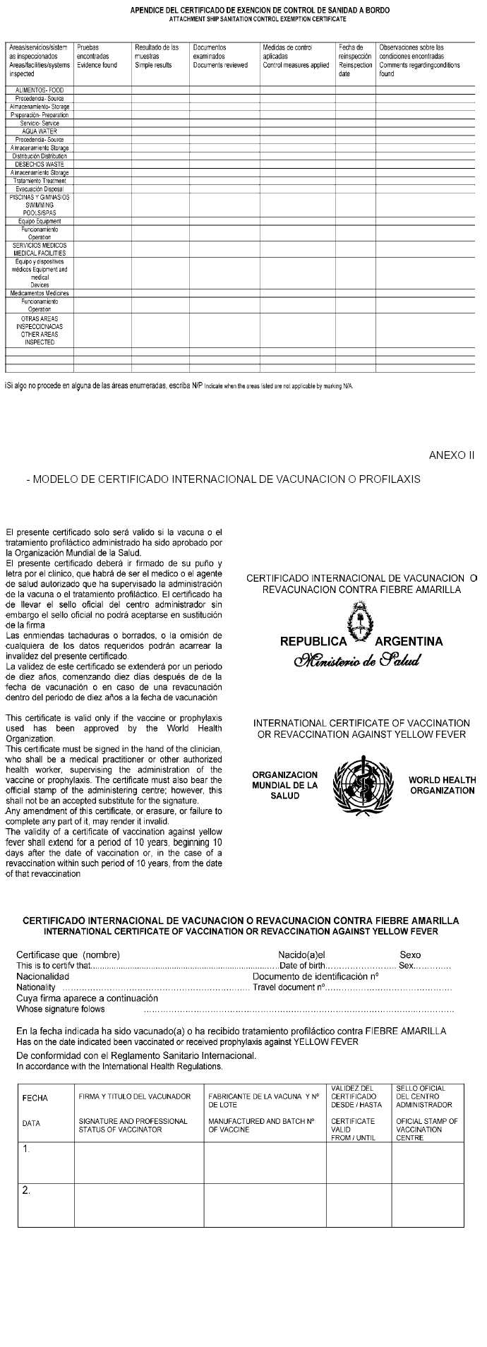 Art. 2º — Apruébense los MODELOS DE CERTIFICADO DE EXENCION DEL CONTROL DE SANIDAD A BORDO/CERTIFICADO DE CONTROL DE SANIDAD A BORDO y el APENDICE DEL MODELO DE CERTIFICADO DE EXENCION DEL CONTROL DE SANIDAD A BORDO/CERTIFICADO DE CONTROL DE SANIDAD A BORDO, que como ANEXO I forma parte integrante de la presente.