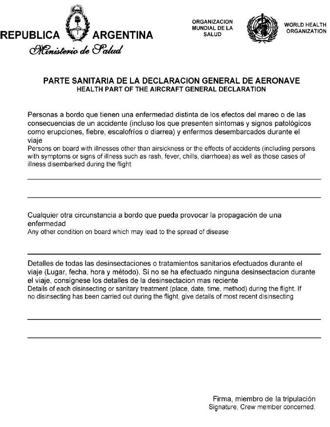 - PARTE SANITARIO DE LA DECLARACION GENERAL DE AERONAVE.