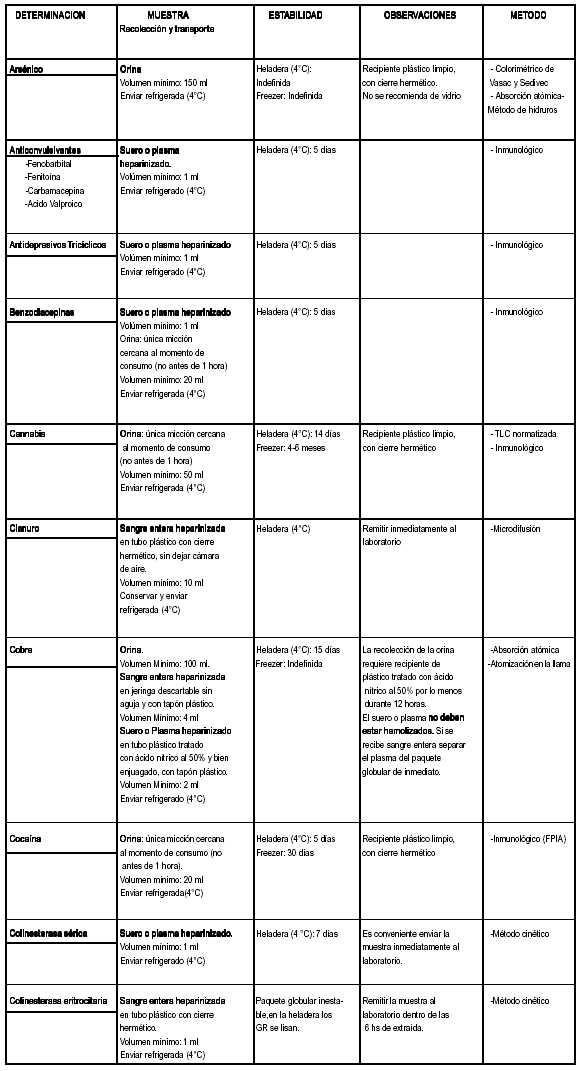 ANEXO I. Introducción ANEXO II. Obtención de muestra y cadena de custodia ANEXO III. Guía para la obtención, transporte, conservación y análisis de muestras en pacientes con probable intoxicación aguda ANEXO IV. Guía para la obtención, transporte, conservación y análisis de muestras en pacientes con probable intoxicación crónica ANEXO V. Guía para la obtención, transporte, conservación y análisis de muestras en pacientes con probable intoxicación por alimentos ANEXO VI. Laboratorios de Análisis Toxicológicos de la República Argentina