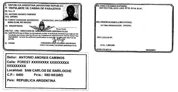 El presente formato de Certificado de Competencia se utiliza como modo de ejemplo. Sus datos son erróneos. En el anverso del Certificado de Competencia es de color celeste y el reverso de la misma es de color blanco.